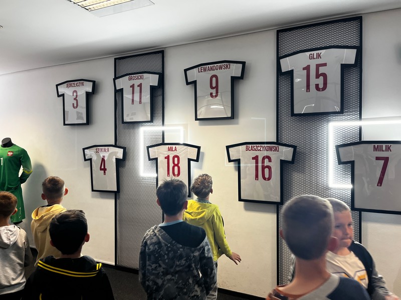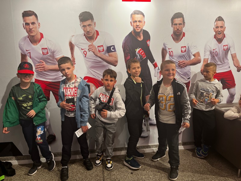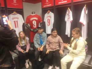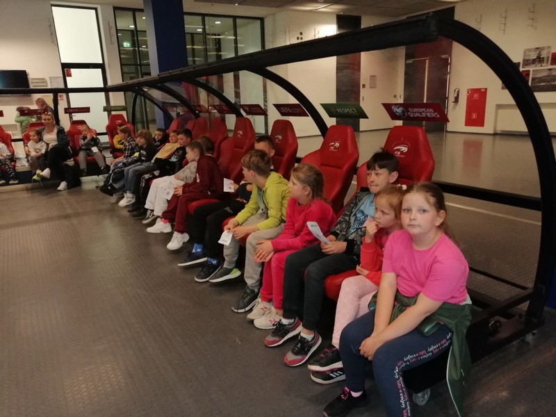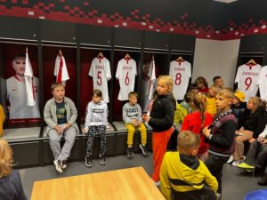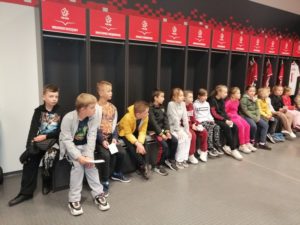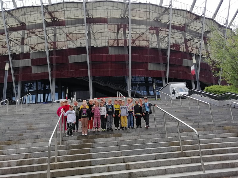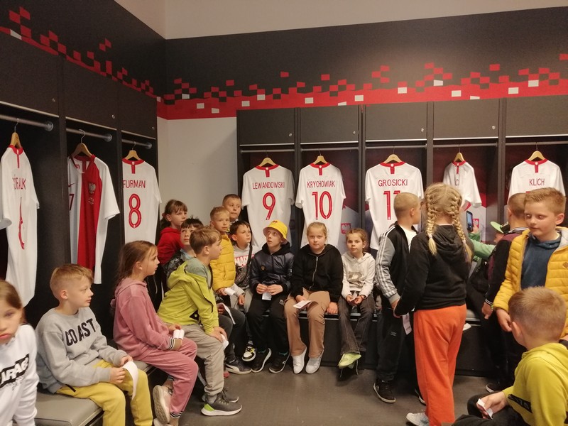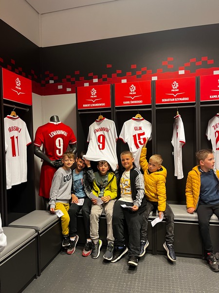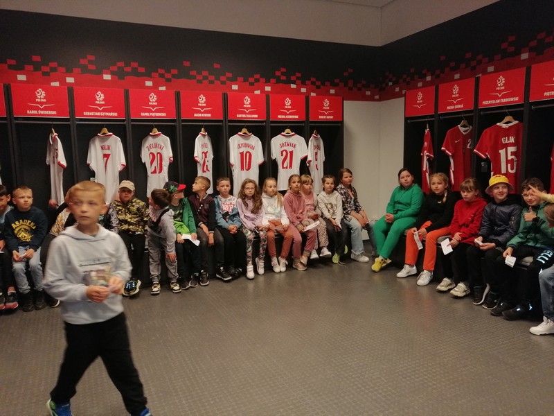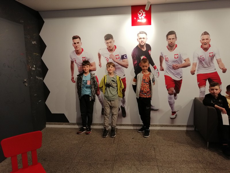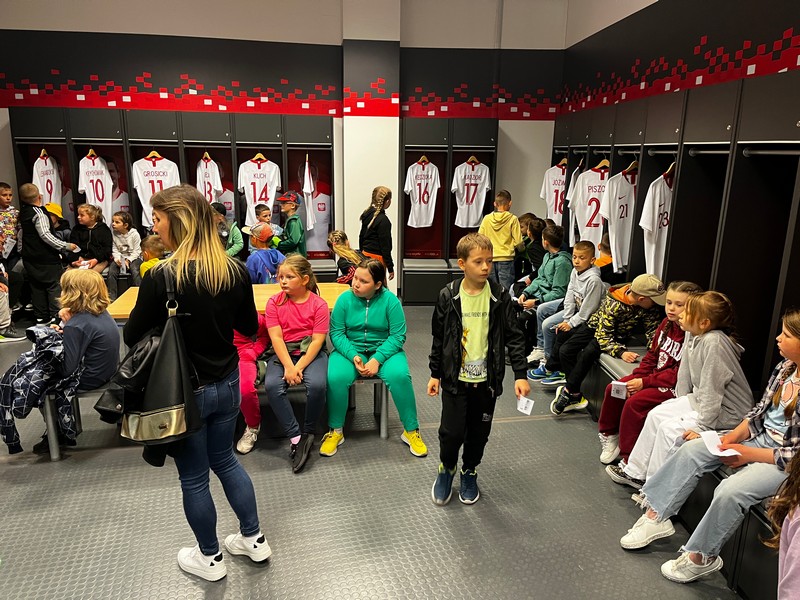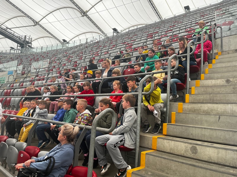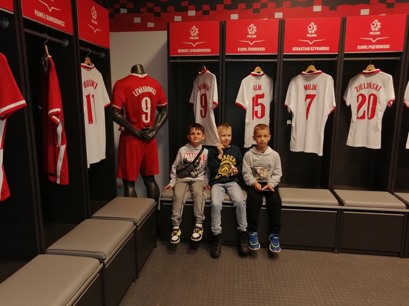 Niezwykle ciekawym miejscem dla uczestników wycieczki był PGE Narodowy. Wśród naszych uczniów jest wielu kibiców piłki nożnej i wizyta na tym stadionie była spełnieniem ich marzeń. Gdy weszliśmy na trybuny i wspięliśmy się na ich szczyt, z góry podziwialiśmy ogrom tego obiektu. Naprawdę, robi wrażenie! Mogliśmy odwiedzić szatnię naszej kadry narodowej i zobaczyć miejsca związane z takimi zawodnikami jak: Robert Lewandowski czy Wojciech Szczęsny. Radość chłopców była ogromna!