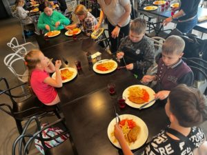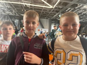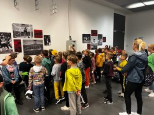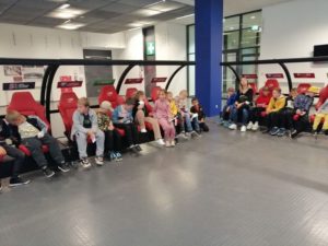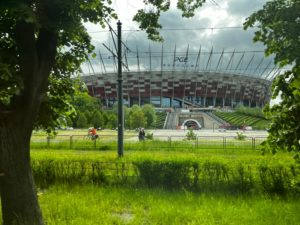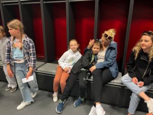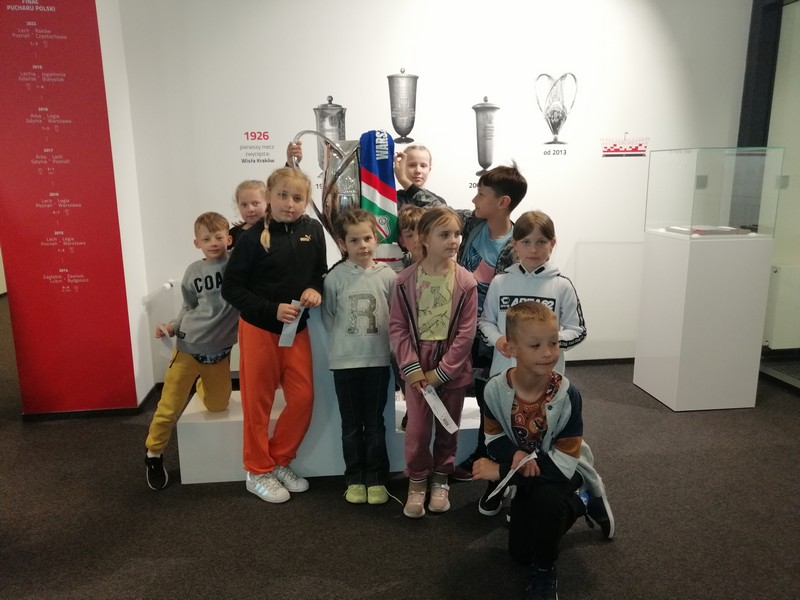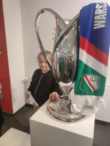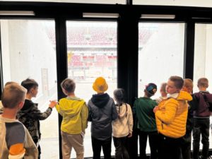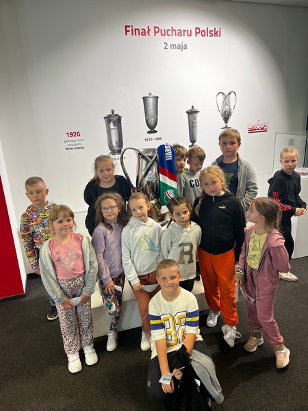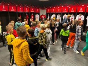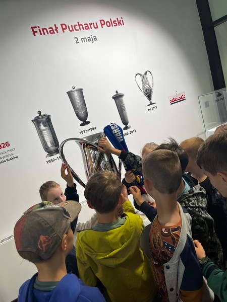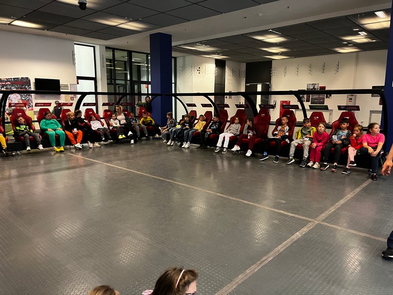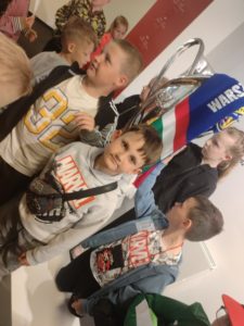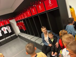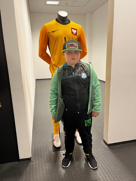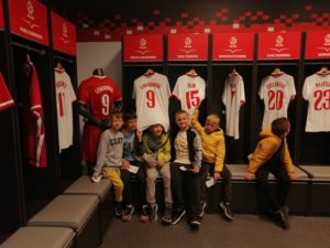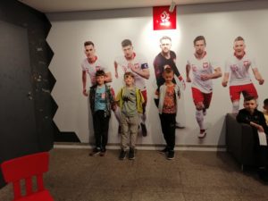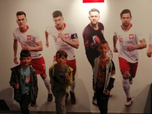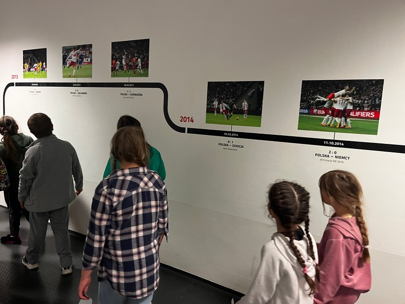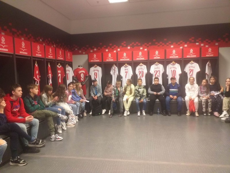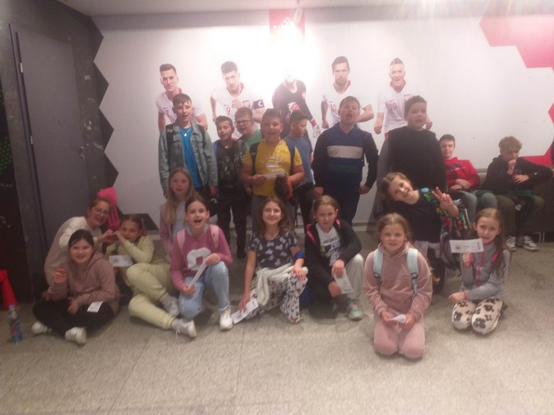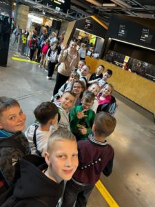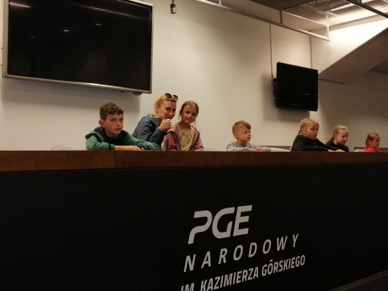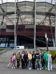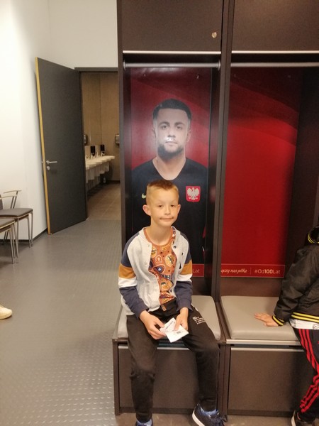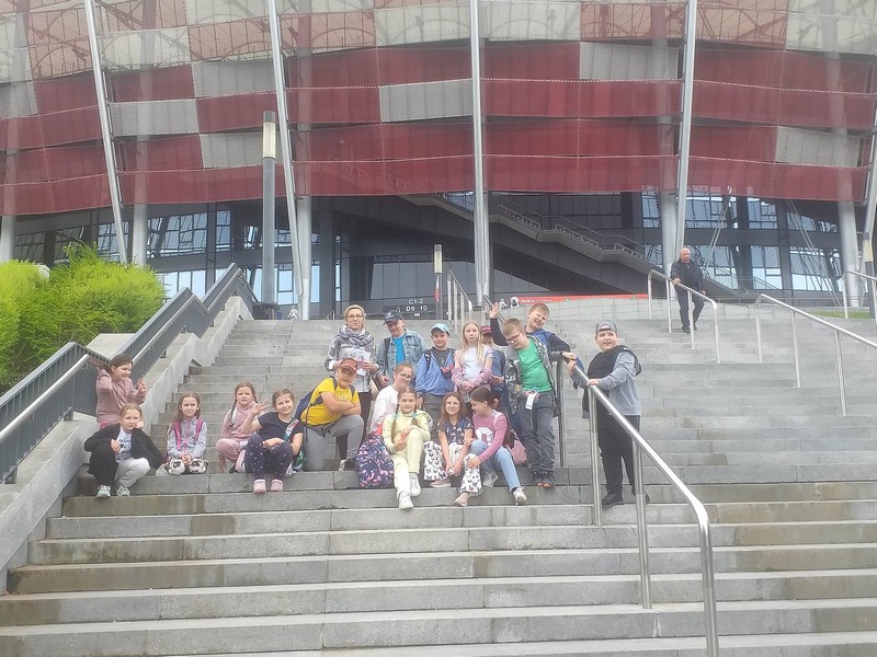 Niezwykle ciekawym miejscem dla uczestników wycieczki był PGE Narodowy. Wśród naszych uczniów jest wielu kibiców piłki nożnej i wizyta na tym stadionie była spełnieniem ich marzeń. Gdy weszliśmy na trybuny i wspięliśmy się na ich szczyt, z góry podziwialiśmy ogrom tego obiektu. Naprawdę, robi wrażenie! Mogliśmy odwiedzić szatnię naszej kadry narodowej i zobaczyć miejsca związane z takimi zawodnikami jak: Robert Lewandowski czy Wojciech Szczęsny. Radość chłopców była ogromna!