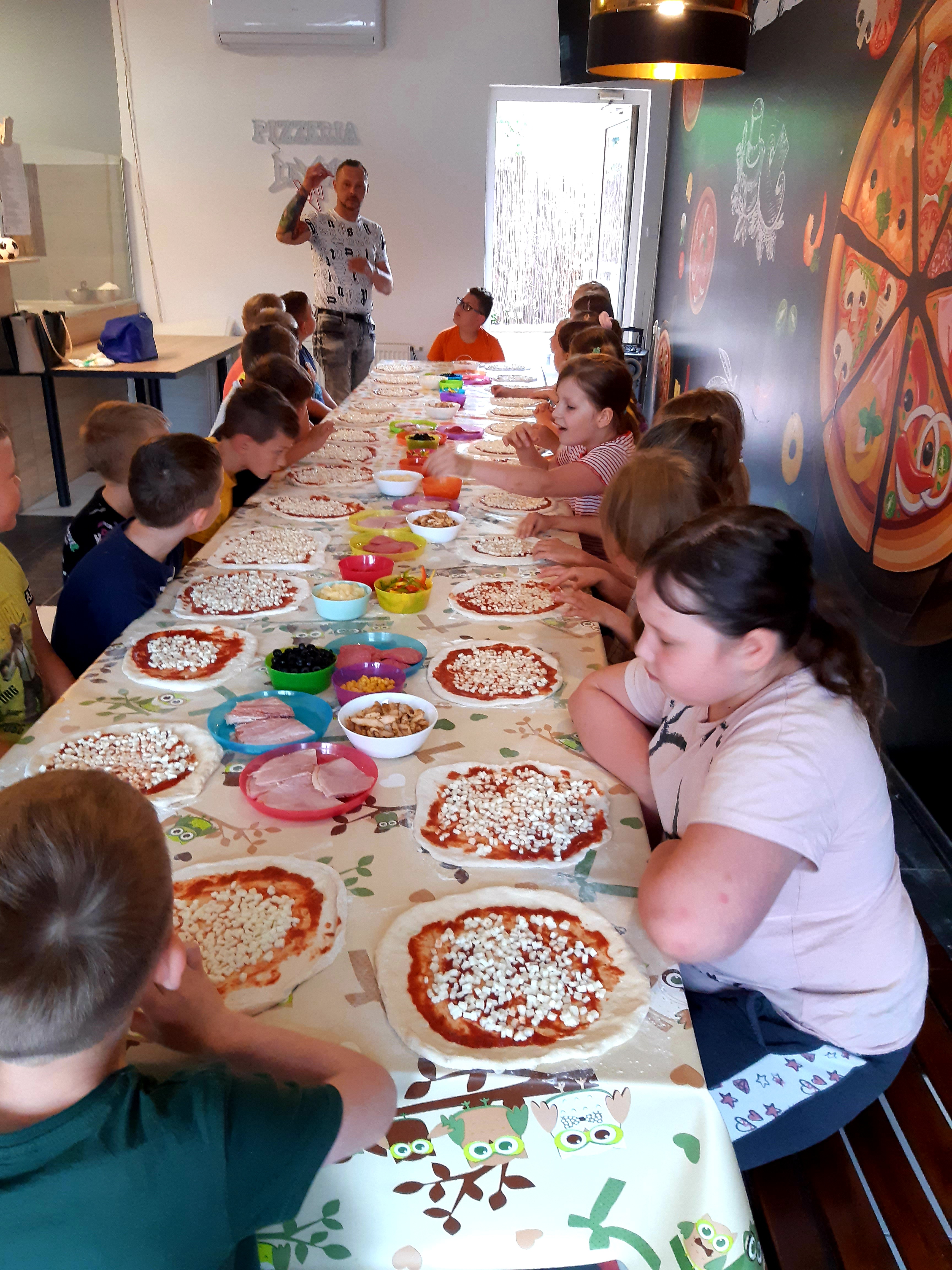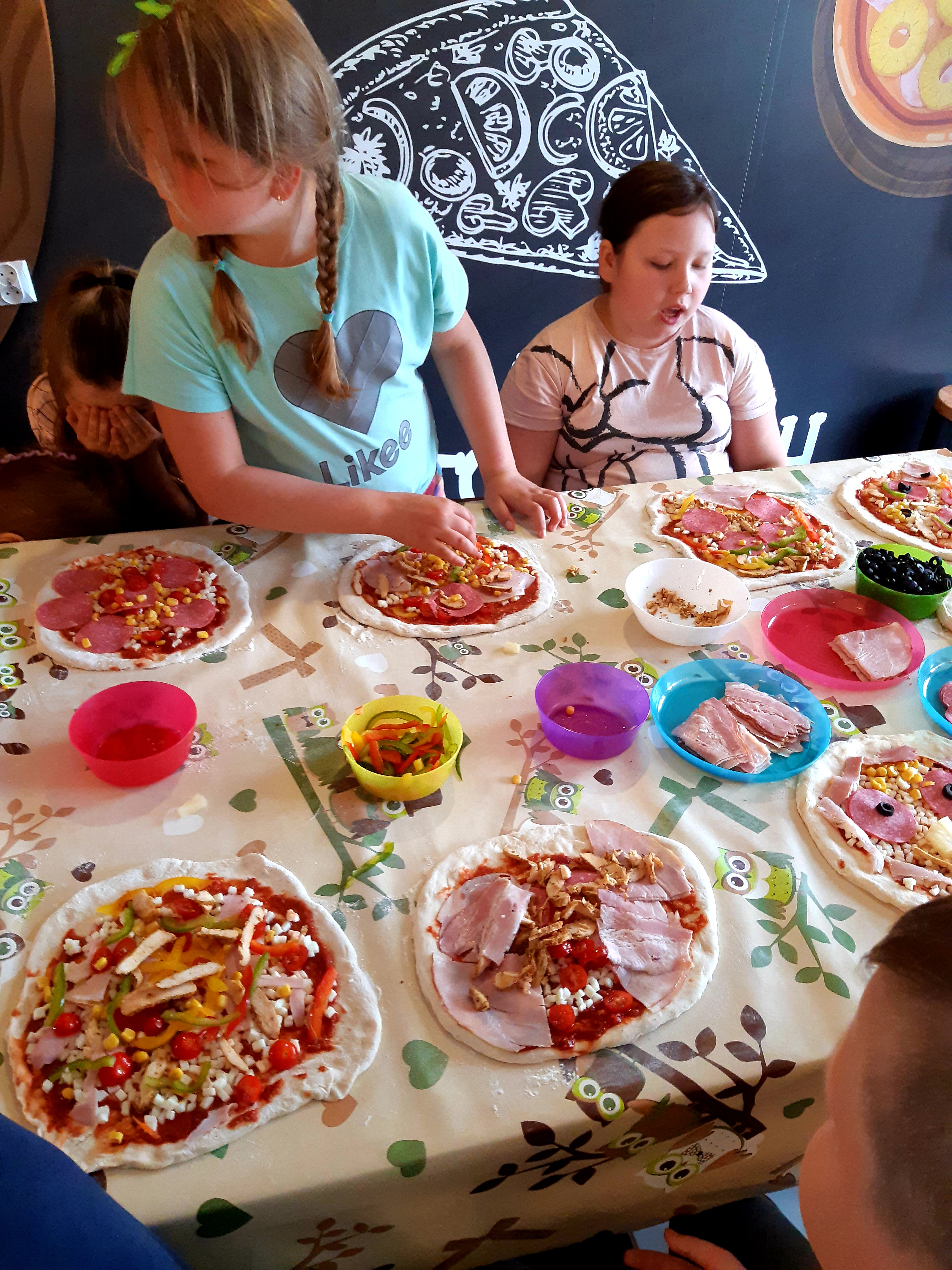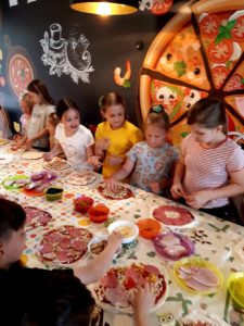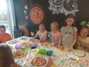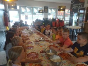 Uczniowie dowiedzieli się w jaki sposób robi się ciasto na pizzę i poznały składniki używane do jej przygotowania. Następnie własnoręcznie robiły pizzę, dobierając ulubione dodatki tworzyły indywidualne kompozycje smakowe. Po upieczeniu pizza pachniała wyśmienicie, wszyscy ze smakiem konsumowali swoje dzieła. Na koniec każde dziecko otrzymało dyplom Szefa Kuchni. Wycieczka była bardzo udana, dzieci wróciły do szkoły w doskonałych humorach.