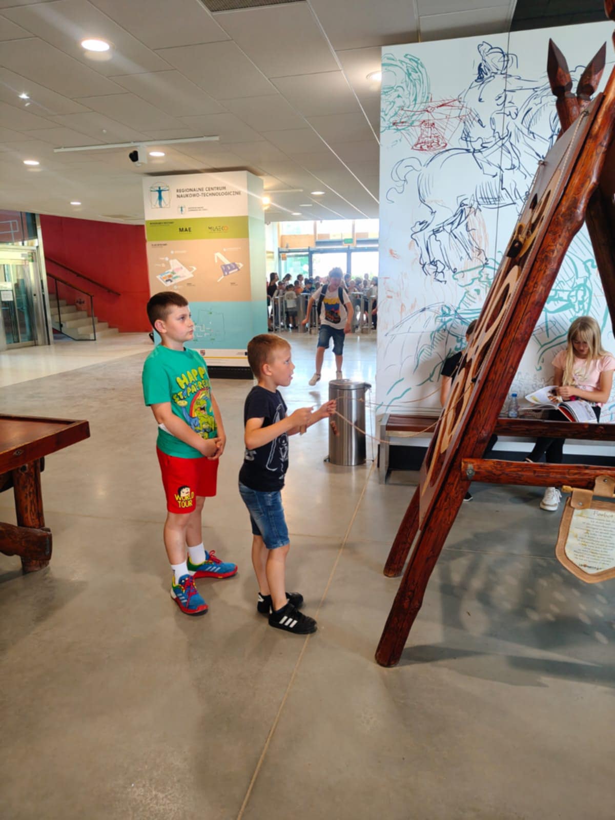 Następnie udaliśmy się do Centrum Nauki Leonardo da Vinci w Podzamczu Chęcińskim. To nowoczesne miejsce łączące naukę z zabawą zrobiło na nas ogromne wrażenie. Uczniowie mogli samodzielnie eksperymentować, dotykać eksponatów i poznawać prawa fizyki, biologii oraz medycyny w przystępny sposób. Największą atrakcją była wystawa poświęcona wynalazkom Leonarda da Vinci.