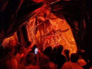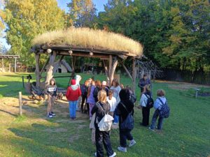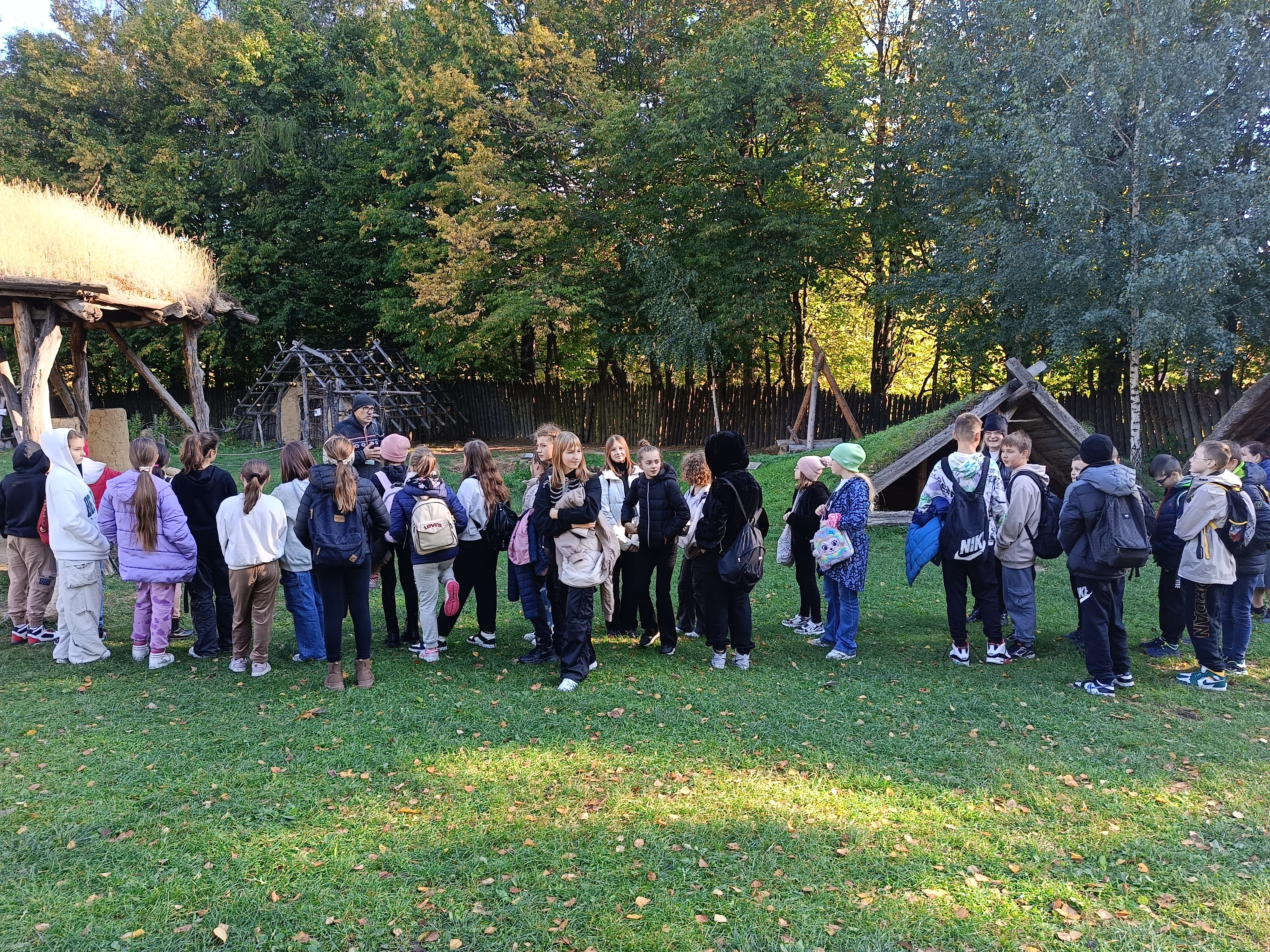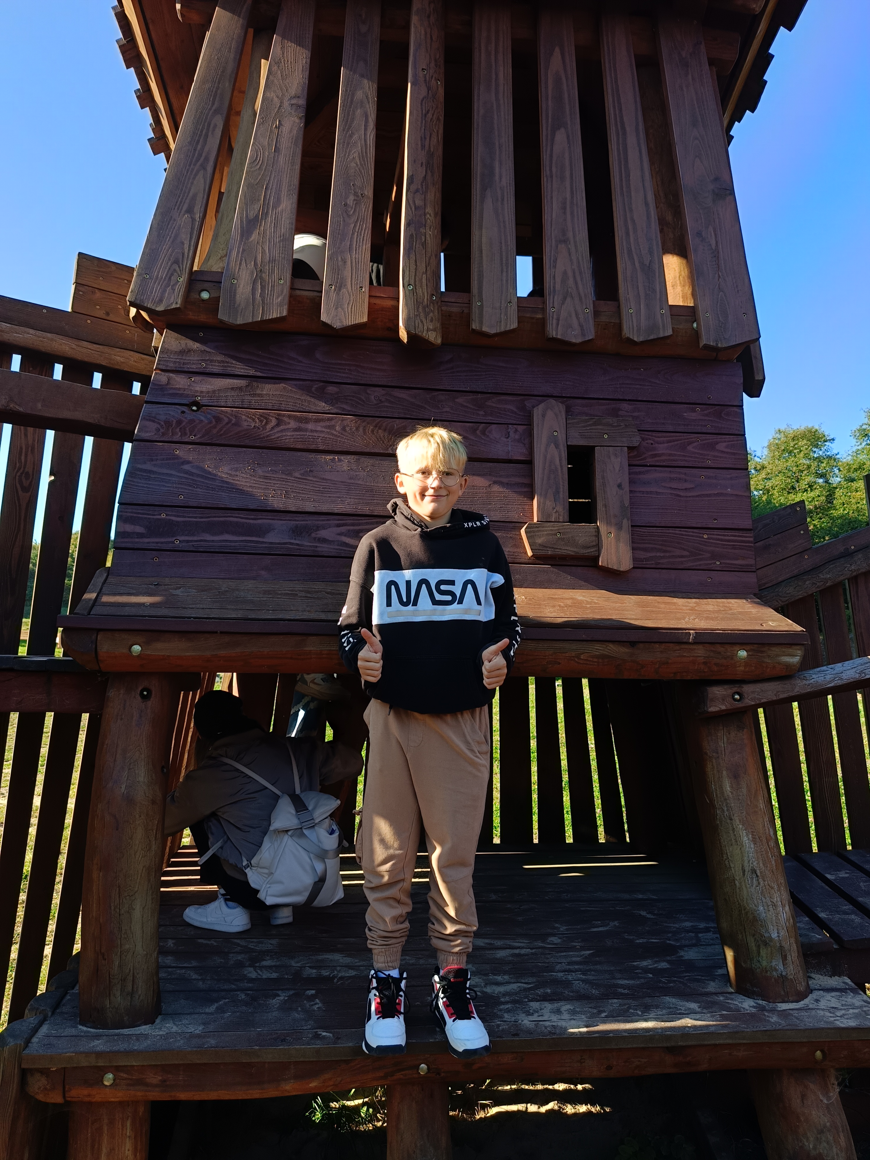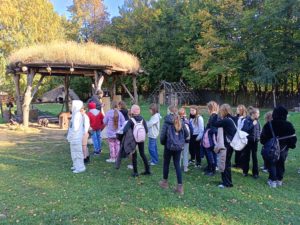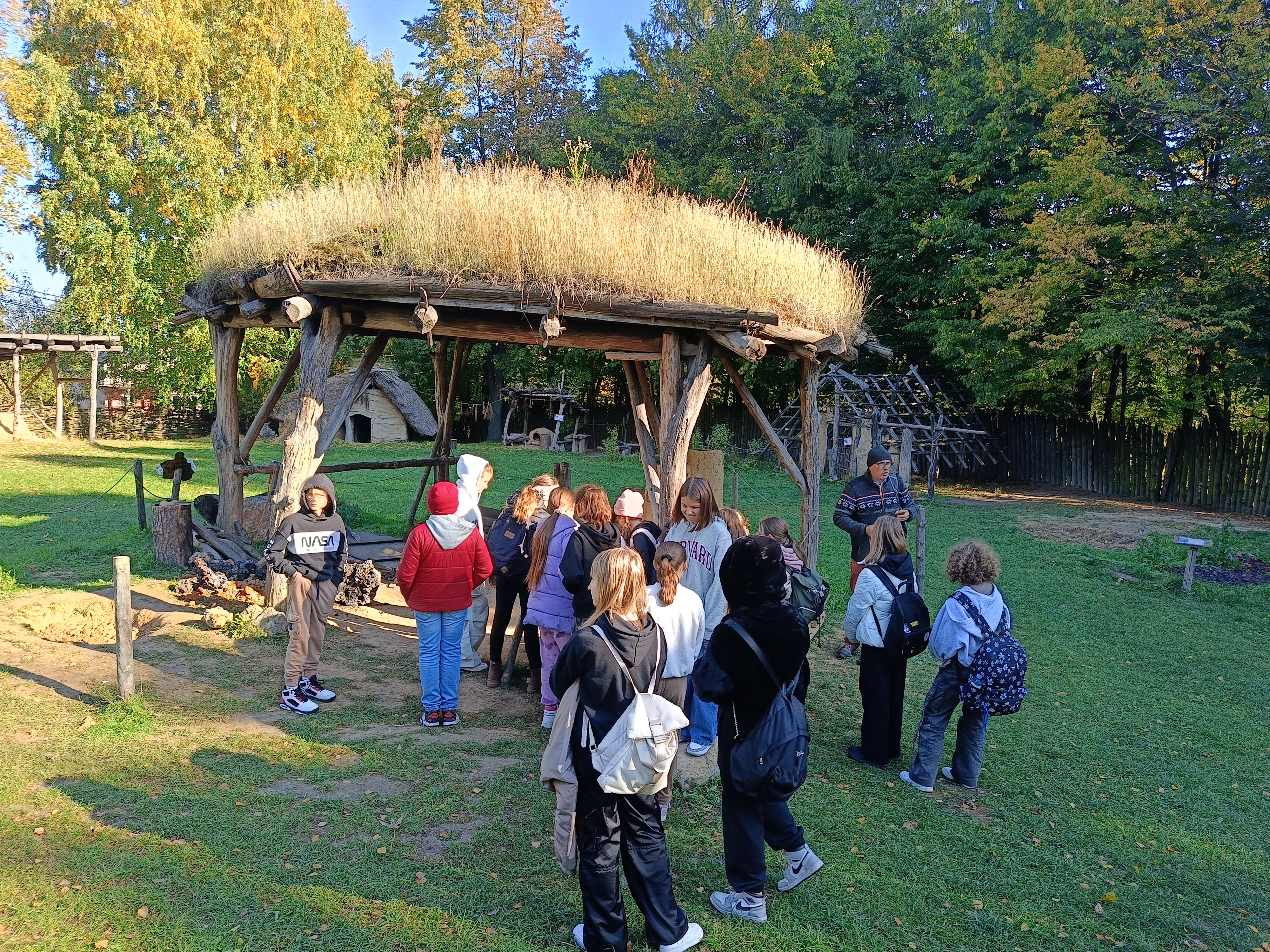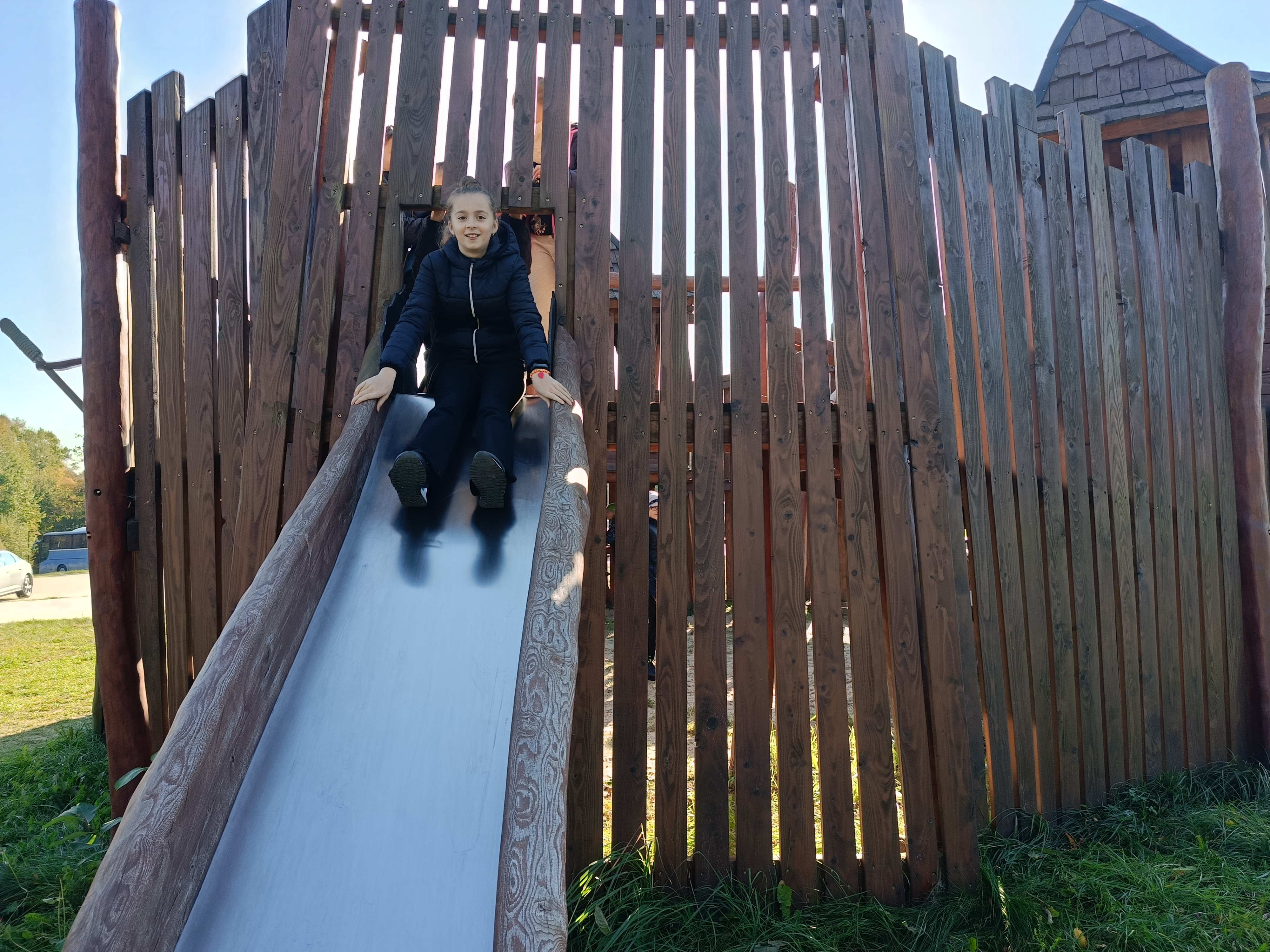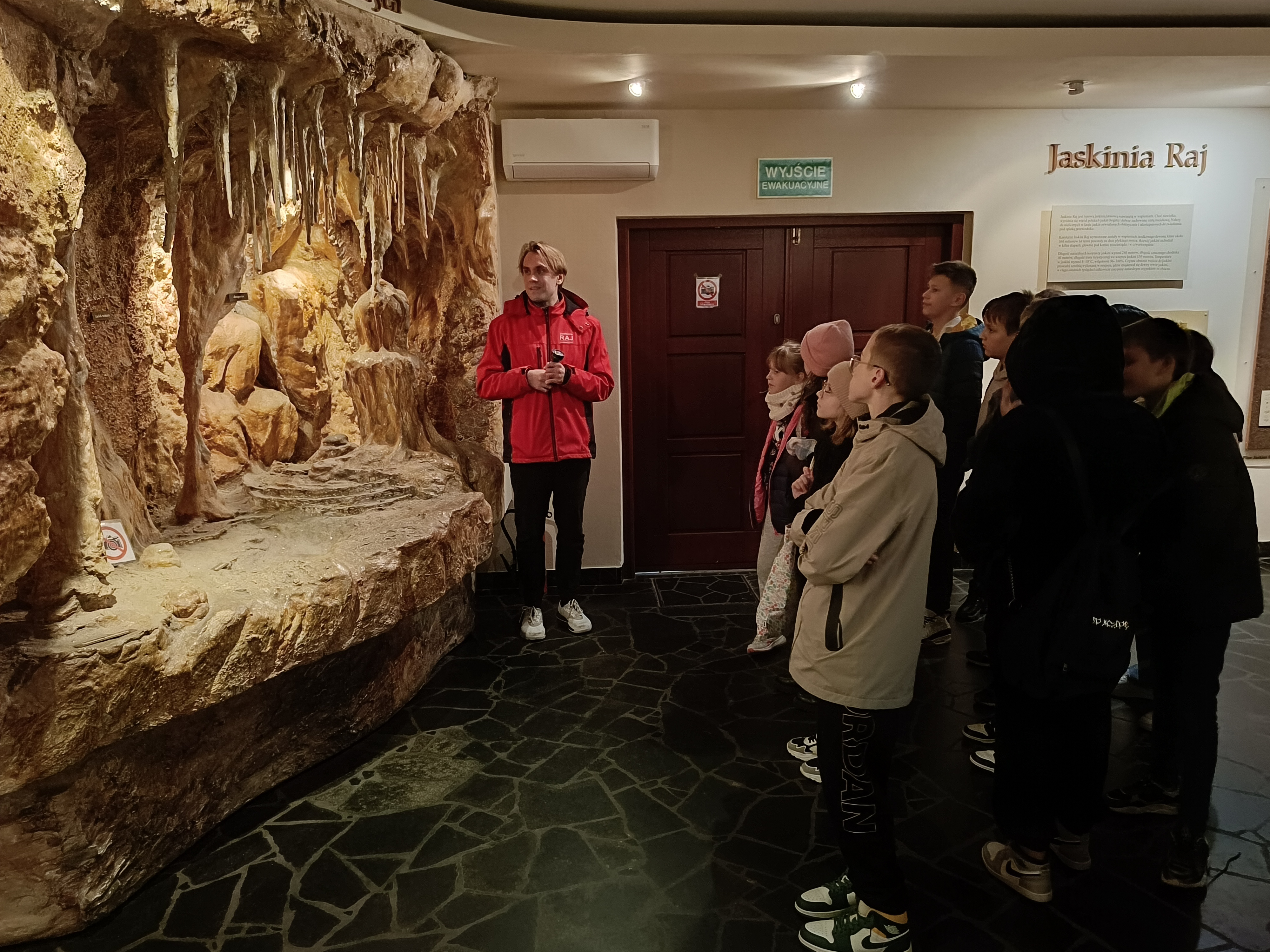 Na początek dzieci zwiedziły Muzeum Starożytnego Hutnictwa w Nowej Słupi, a potem najnowszy w regionie obiekt turystyczny – Park Legend. Piątoklasiści dowiedzieli się, skąd się wzięło Madejowe łoże, czym zawinił zbój Kak oraz jak wyglądały sabaty czarownic na Łysej Górze. Legendy świętokrzyskie to świat pełen magii. Interaktywne muzeum legend zrobiło na wszystkich duże wrażenie. Dźwięk, nowoczesne technologie oraz mrok dodawały aury tajemniczości. Największą atrakcją był lot na miotle w okularach VR, w trakcie, którego można było podziwiać województwo świętokrzyskie. Po Parku Legend oprowadzał tajemniczy Pielgrzym, którego rzeźbę dzieci mogły zobaczyć później przy wejściu do Świętokrzyskiego Parku Narodowego i sprawdzić, czy nie przesunął się o ziarenko piasku. Kolejnym etapem podróży była Jaskinia Raj – jedna z najbardziej znanych atrakcji turystycznych Gór Świętokrzyskich i jedna z najpiękniejszych jaskiń krasowych w Polsce. Jaskinia urzekła nas bogactwem i różnorodnością kalcytowych form naciekowych – stalaktytów i stalagmitów o unikatowym na skalę światową zagęszczeniu, często o oryginalnych kształtach, w których każdy z nas widział coś innego. Z wycieczki przywieźliśmy wiele miłych wspomnień i dużo zdjęć.