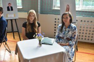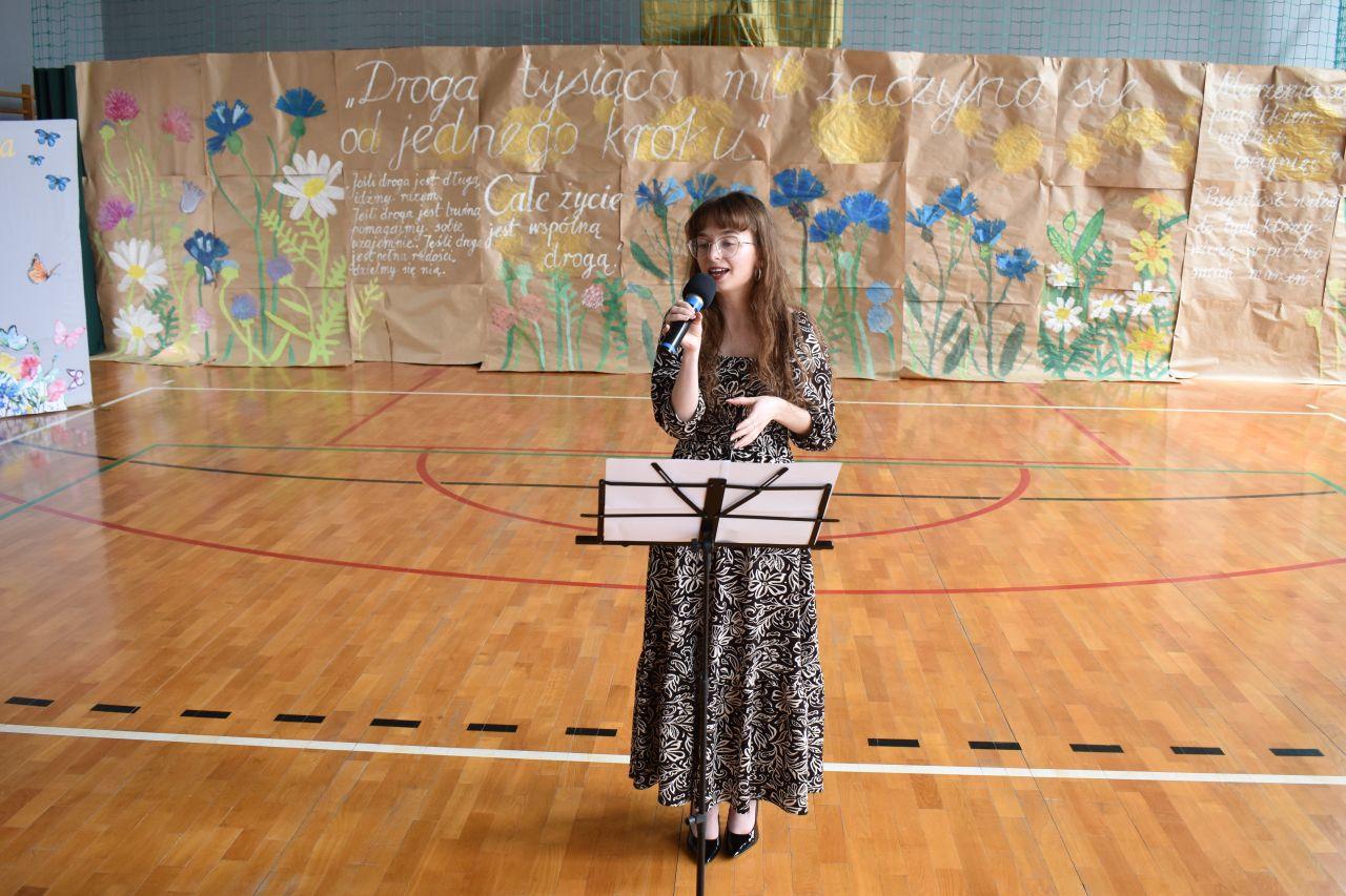 Wśród zaproszonych gości znalazła się również absolwentka naszej szkoły – Pani Jolanta Szymczyk – studentka piątego roku architektury, której pasją jest także śpiew, czego próbkę dała podczas części artystycznej imprezy, wykonując utwór Agnieszki Osieckiej pt.,,Wielka woda” i musicalowy przebój pt. „Gdy uwierzysz”. Pani dyrektor Małgorzata Trelka powitała również członkinie Koła Gospodyń Wiejskich „Trabliczanki” oraz głównych bohaterów tej uroczystości – prymusów z poszczególnych szkół, ich rodziców i wychowawców.