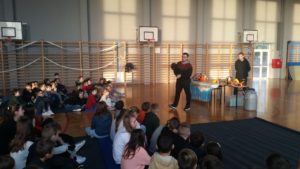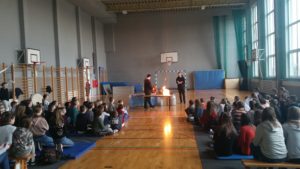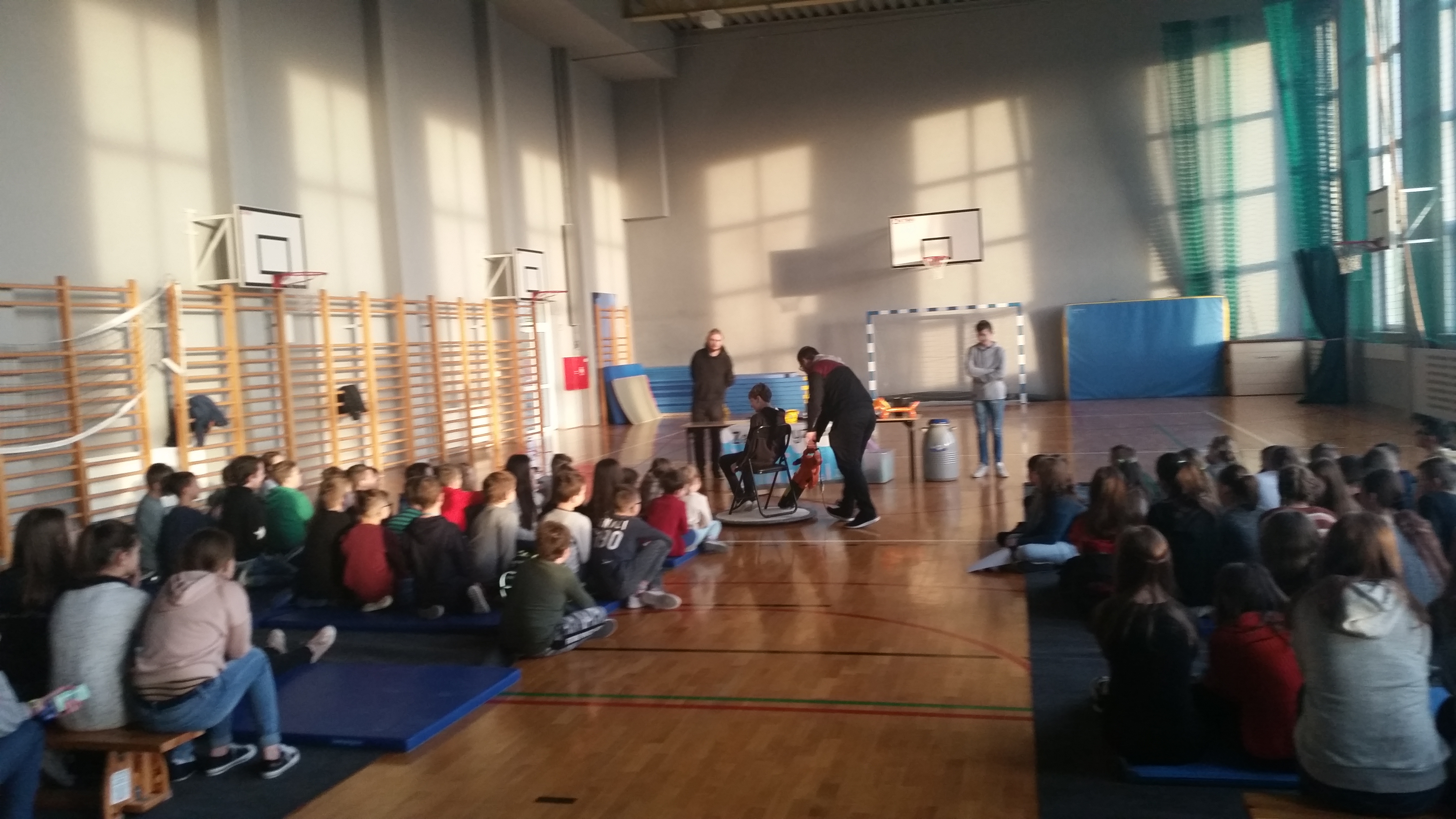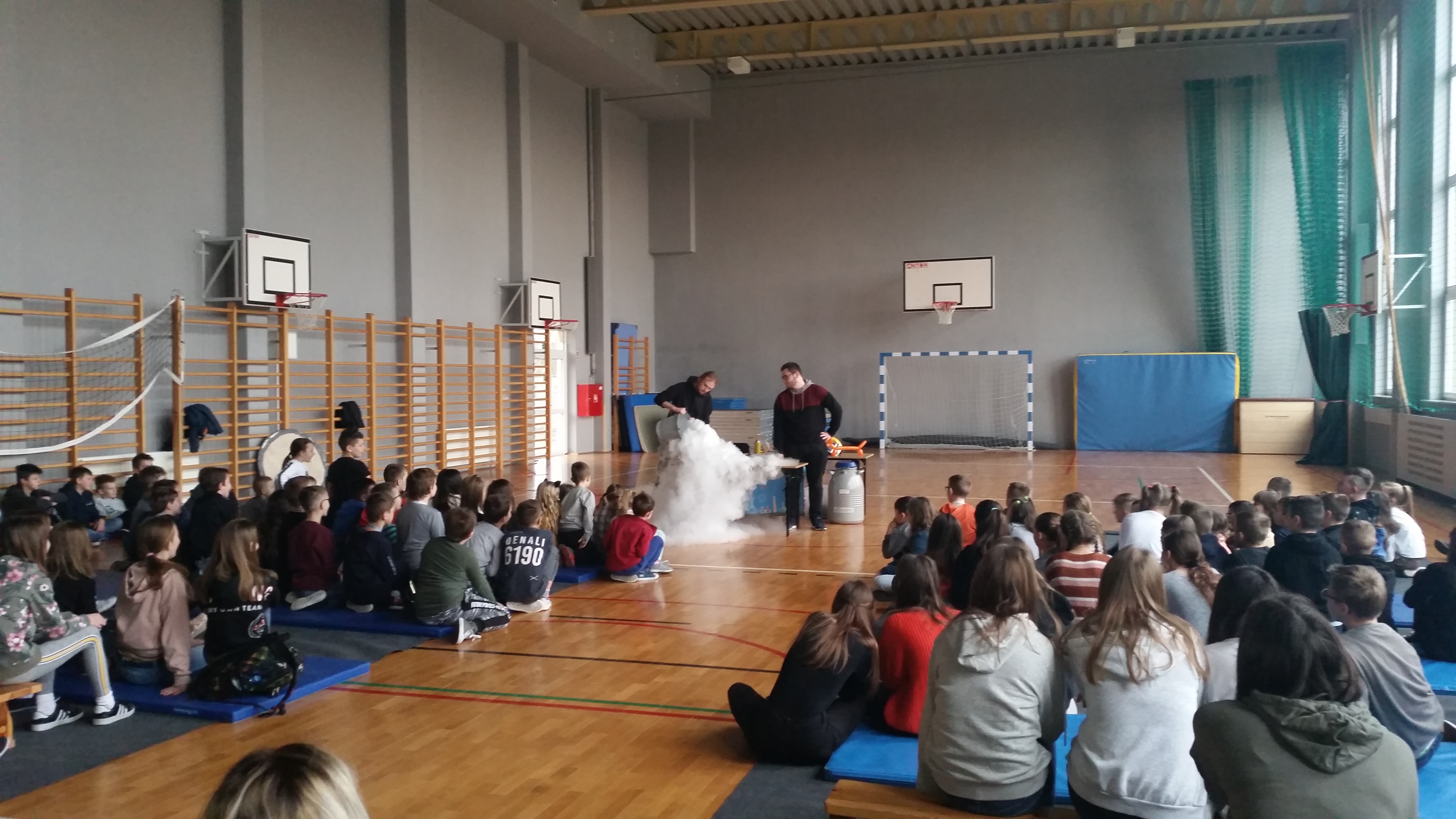 Panowie zaprezentowali interaktywny spektakl pt. „Poczuj chemię do fizyki”. Celem pokazu było przybliżenie tajników fizyki i chemii w bardzo prosty i atrakcyjny sposób, zrozumiały dla tych najmłodszych i najstarszych uczniów szkoły. W programie tej lekcji znalazły się eksperymenty, dzięki którym uczniowie mogli obejrzeć i dowiedzieć się na czym polegają: nietypowe spalanie metanu, piłki Bumber Ball, poduszkowiec, palące kulki, doświadczenia z poliakrylem sodu, zabawy z helem, zabawy z ciekłym azotem. Eksperymenty przysporzyły uczniom wiele śmiechu. Atrakcją dla dzieci była możliwość aktywnego uczestnictwa w pokazie i doświadczenia na własnej skórze zjawisk przyrody.