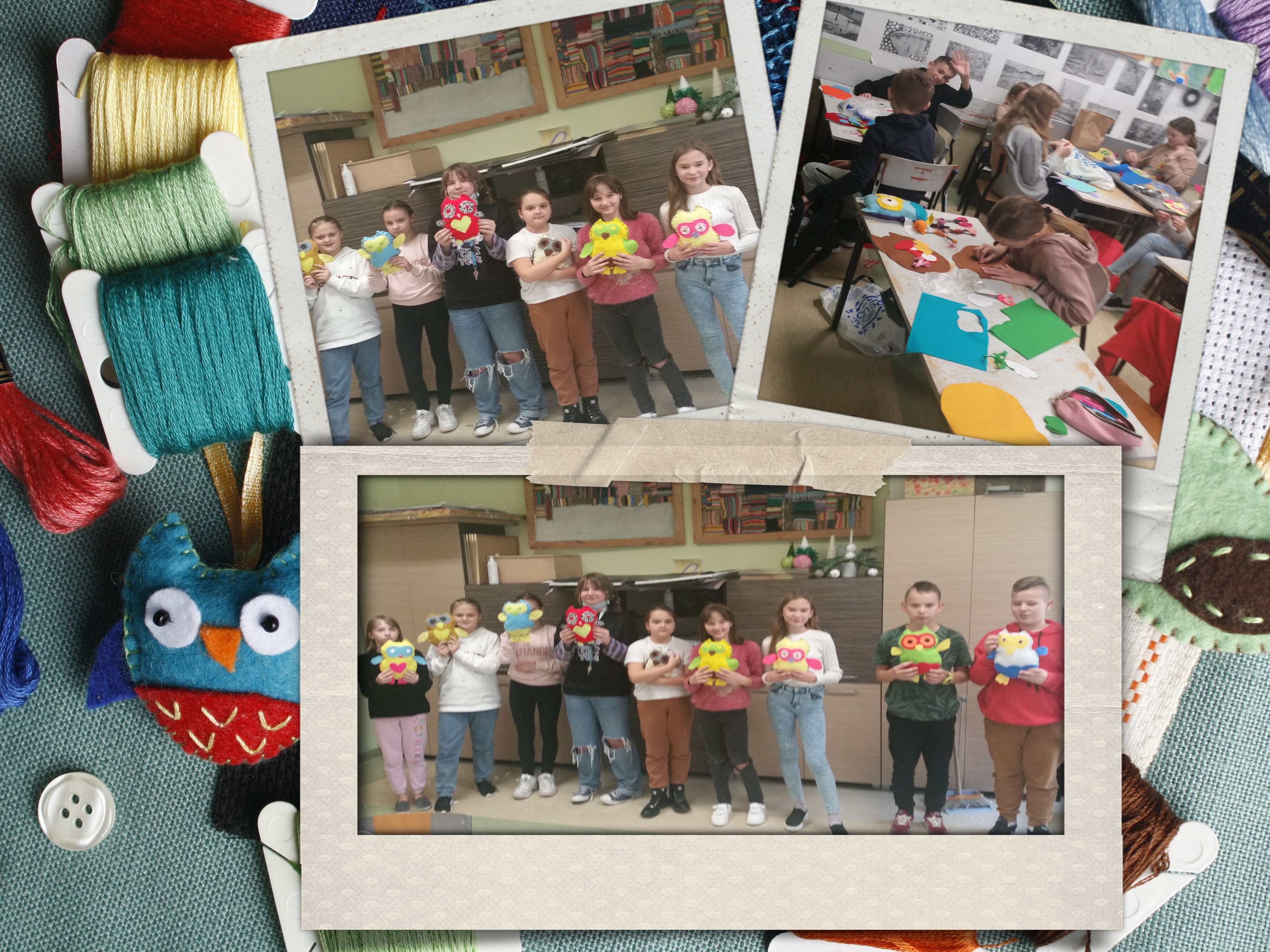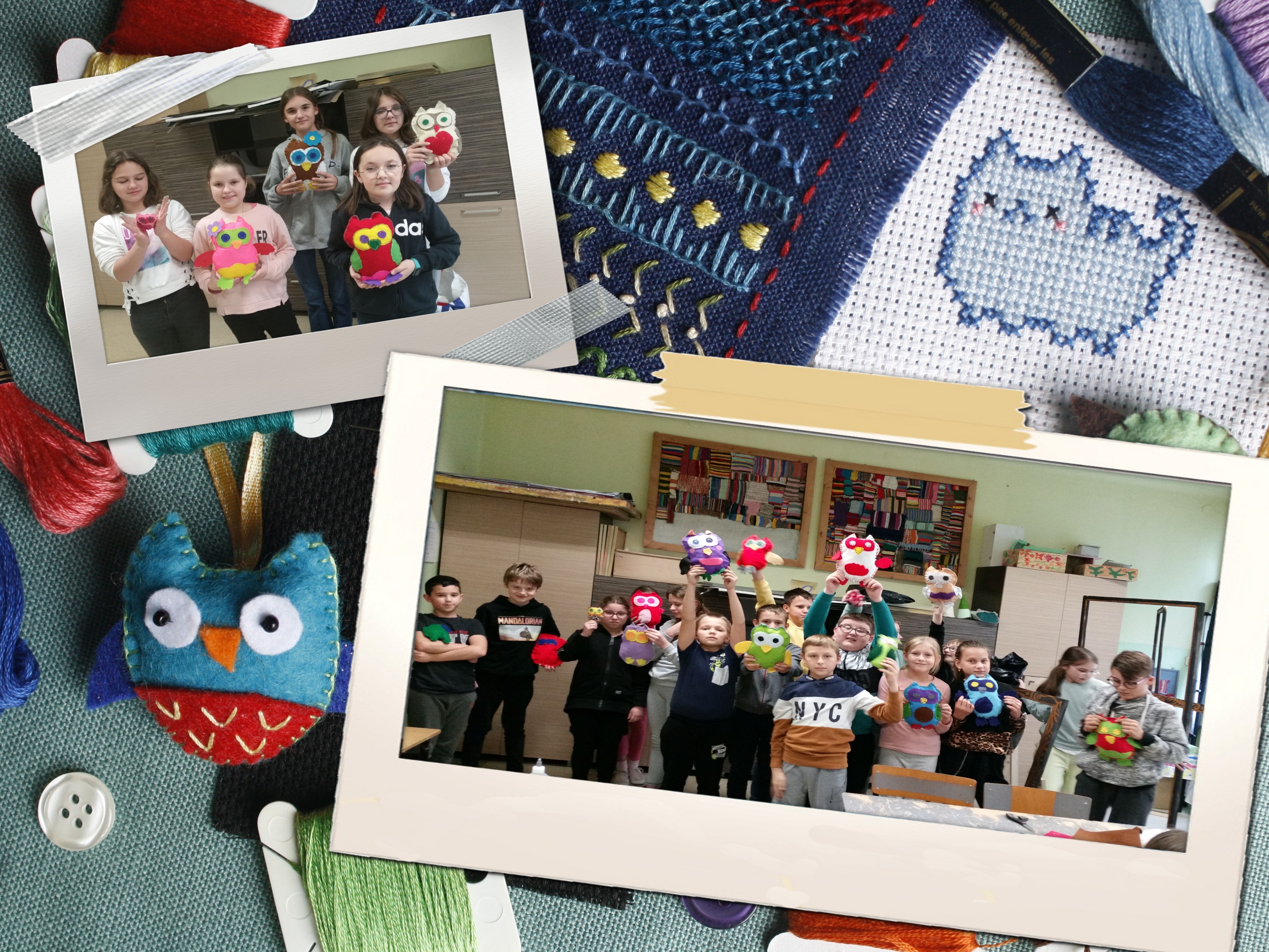 Uczniowie klas piątych na zajęciach techniki szyli przytulanki z filcu. Nie były to łatwe działania, począwszy od: odrysowania sowy na materiale, wycięcia części, po posługiwanie się ostrą igłą, robienie supełków czy prawidłowe wbijanie igły.