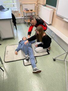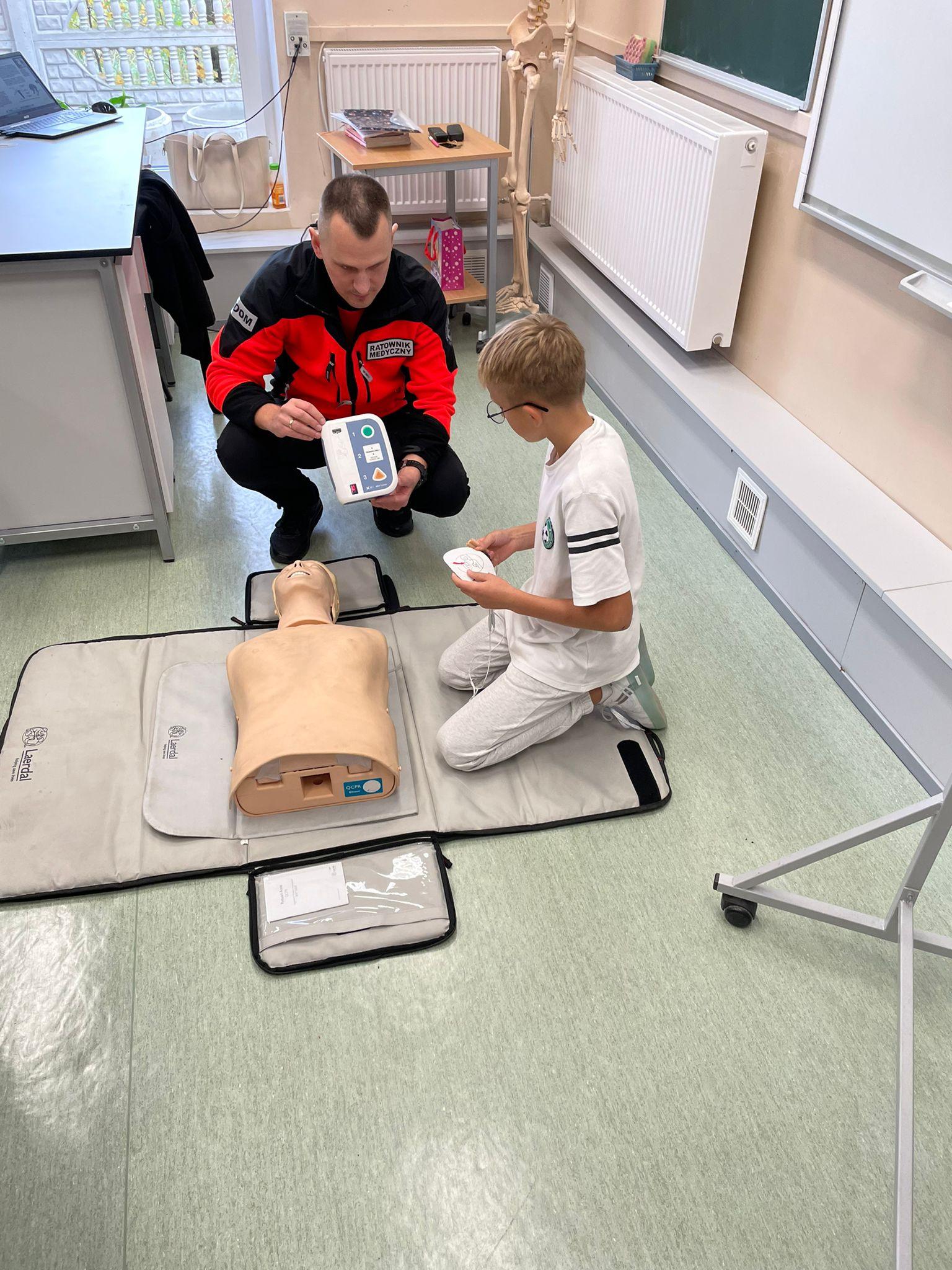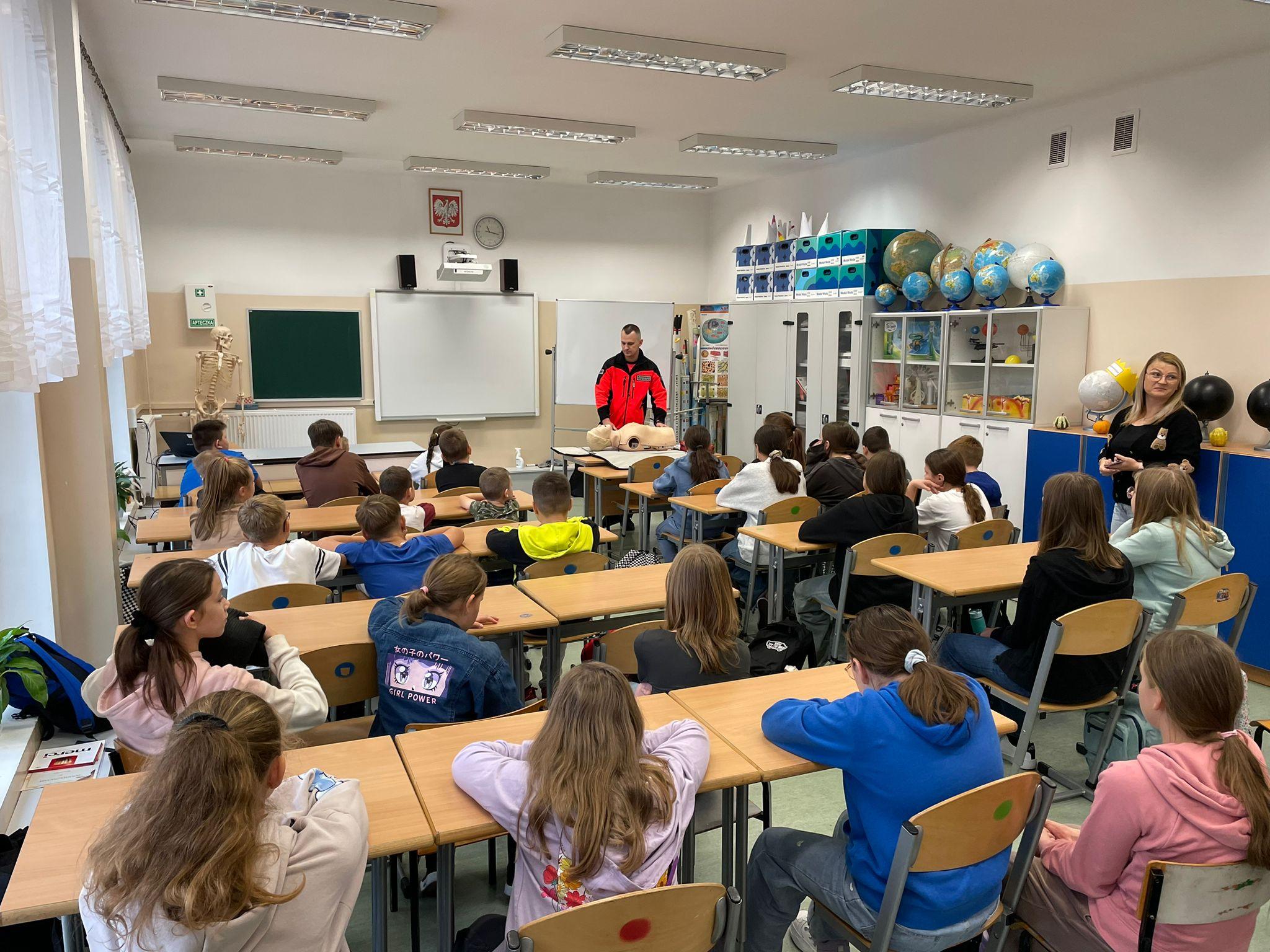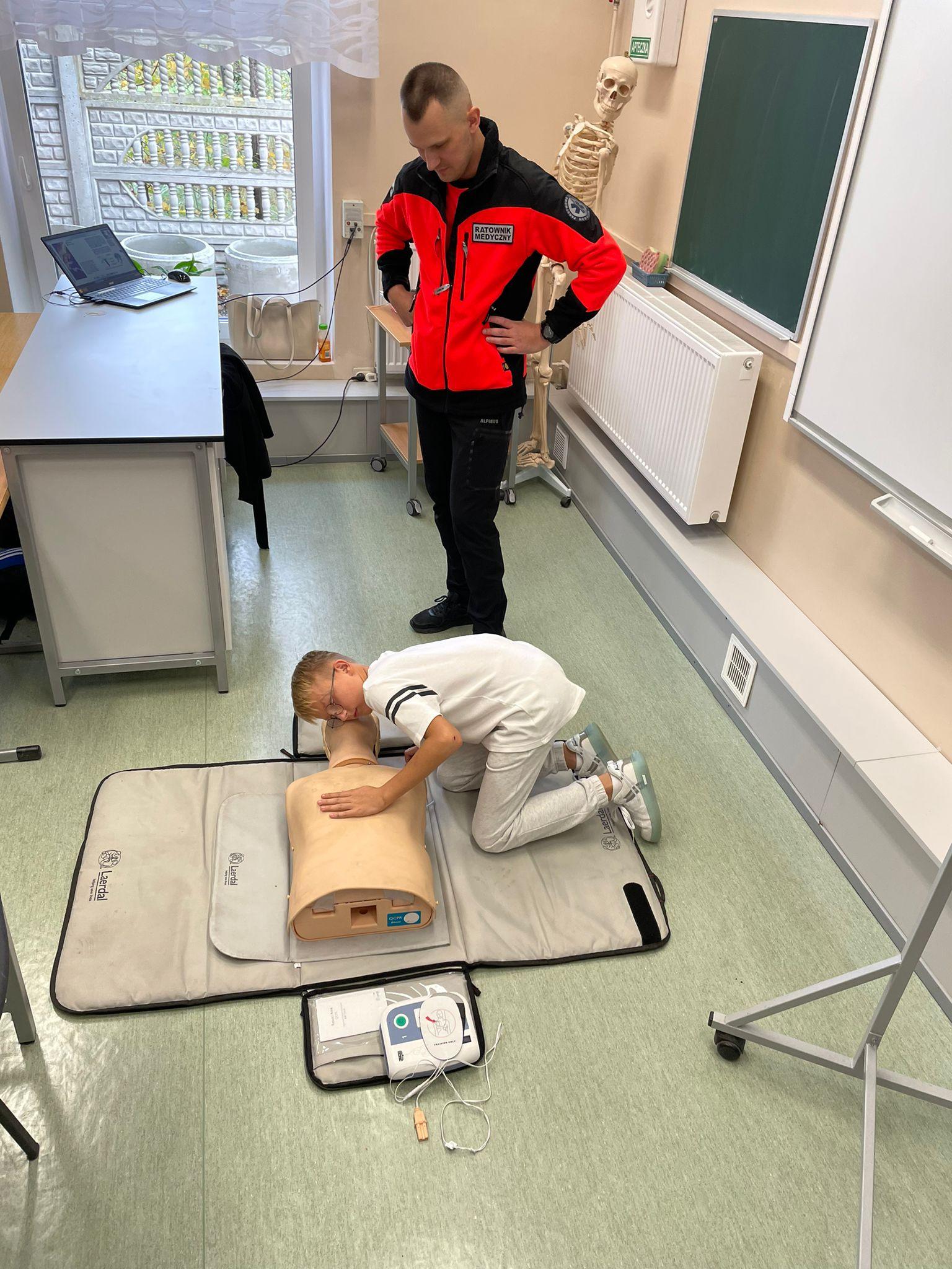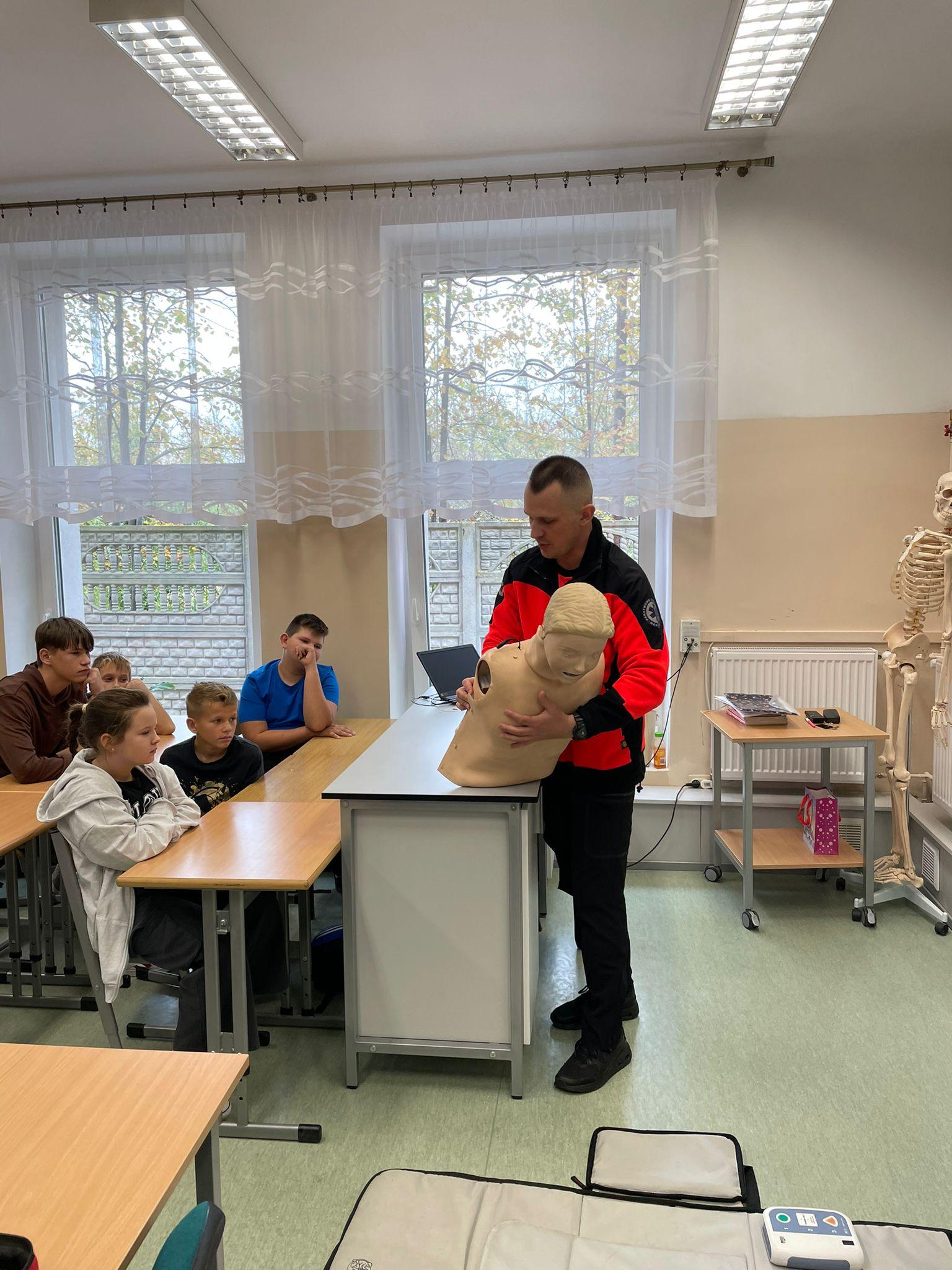 15 października w naszej szkole odbyło się szkolenie z pierwszej pomocy. W wydarzeniu uczestniczyli uczniowie klas: 6a, 6b oraz świetlicy szkolnej. Pod czujnym okiem doświadczonego ratownika nauczyli się, jak reagować w sytuacjach nagłego zagrożenia życia. Ćwiczyli resuscytację krążeniowo-oddechową na fantomie. Uczyli się stosowania pozycji bocznej ustalonej oraz dowiedzieli się, jak skorzystać z AED w sytuacji nagłego zagrożenia życia. Szkolenie dostarczyło również wiedzy na temat tego, jak reagować podczas zadławienia czy złamania kończyny oraz jak skutecznie przekazywać informacje podczas rozmowy z dyspozytorem. Uczniowie nie tylko uważnie słuchali, ale także aktywnie uczestniczyli w ćwiczeniach praktycznych co pozwoliło im lepiej przyswoić prezentowane zagadnienia. Całe szkolenie było bardzo wartościowe i dostarczyło wiedzy, która może pomóc w realnych sytuacjach zagrożenia zdrowia i życia. Serdecznie dziękujemy p. Bartoszowi Lipcowi pracownikowi Pogotowia Ratunkowego w Radomiu za przeprowadzenie tego niezwykle cennego szkolenia oraz za przekazanie uczniom tak ważnych umiejętności!