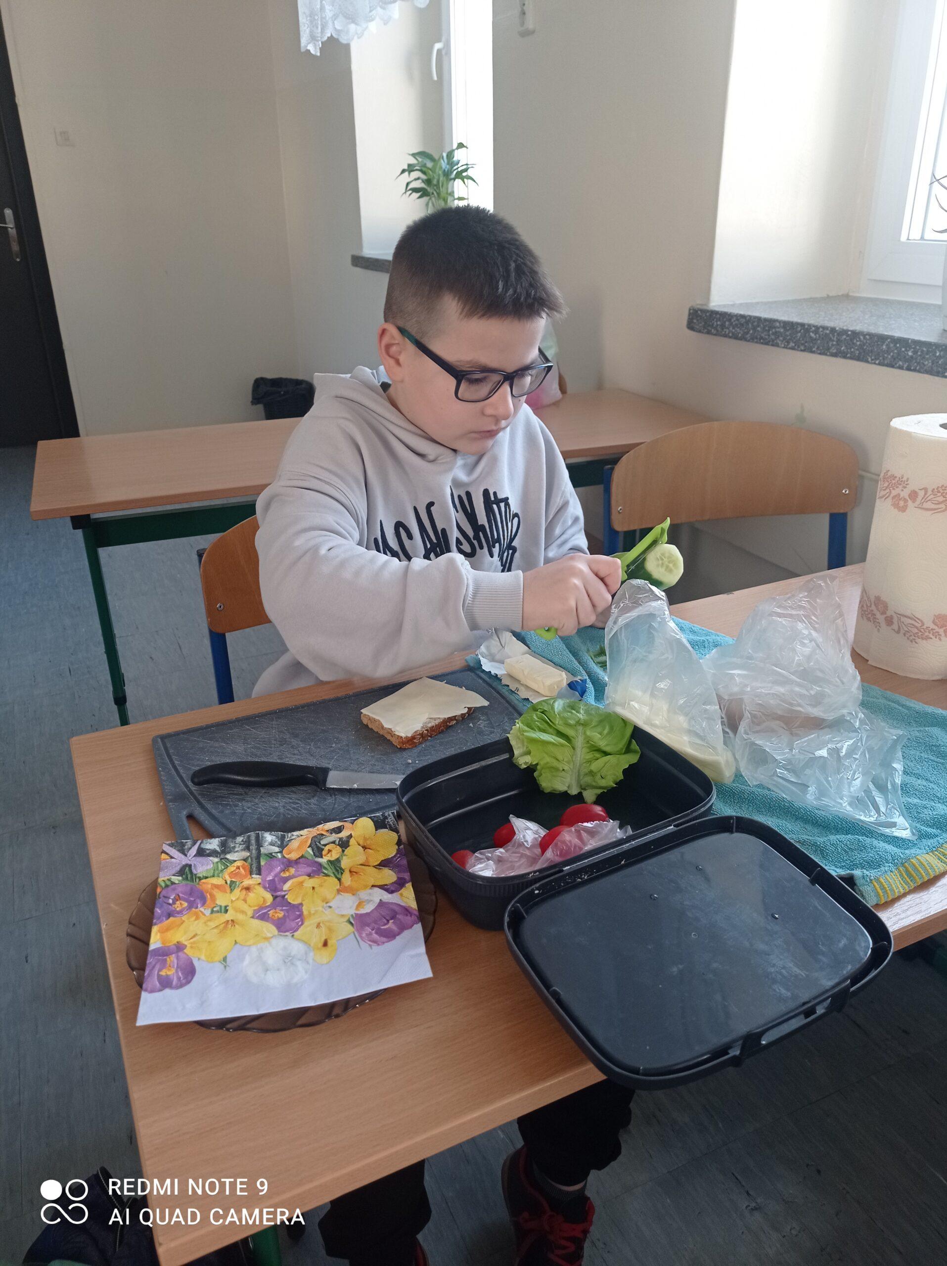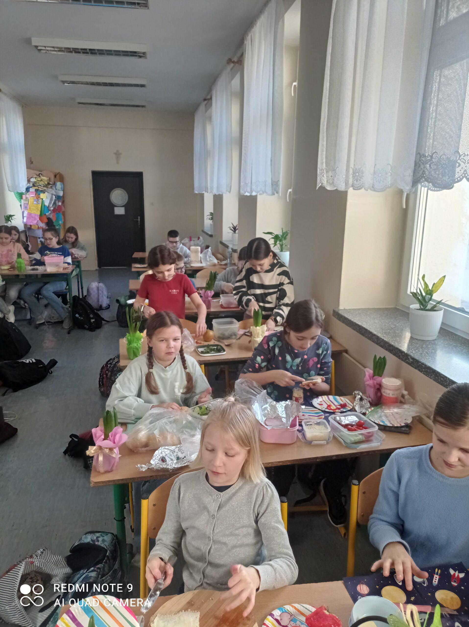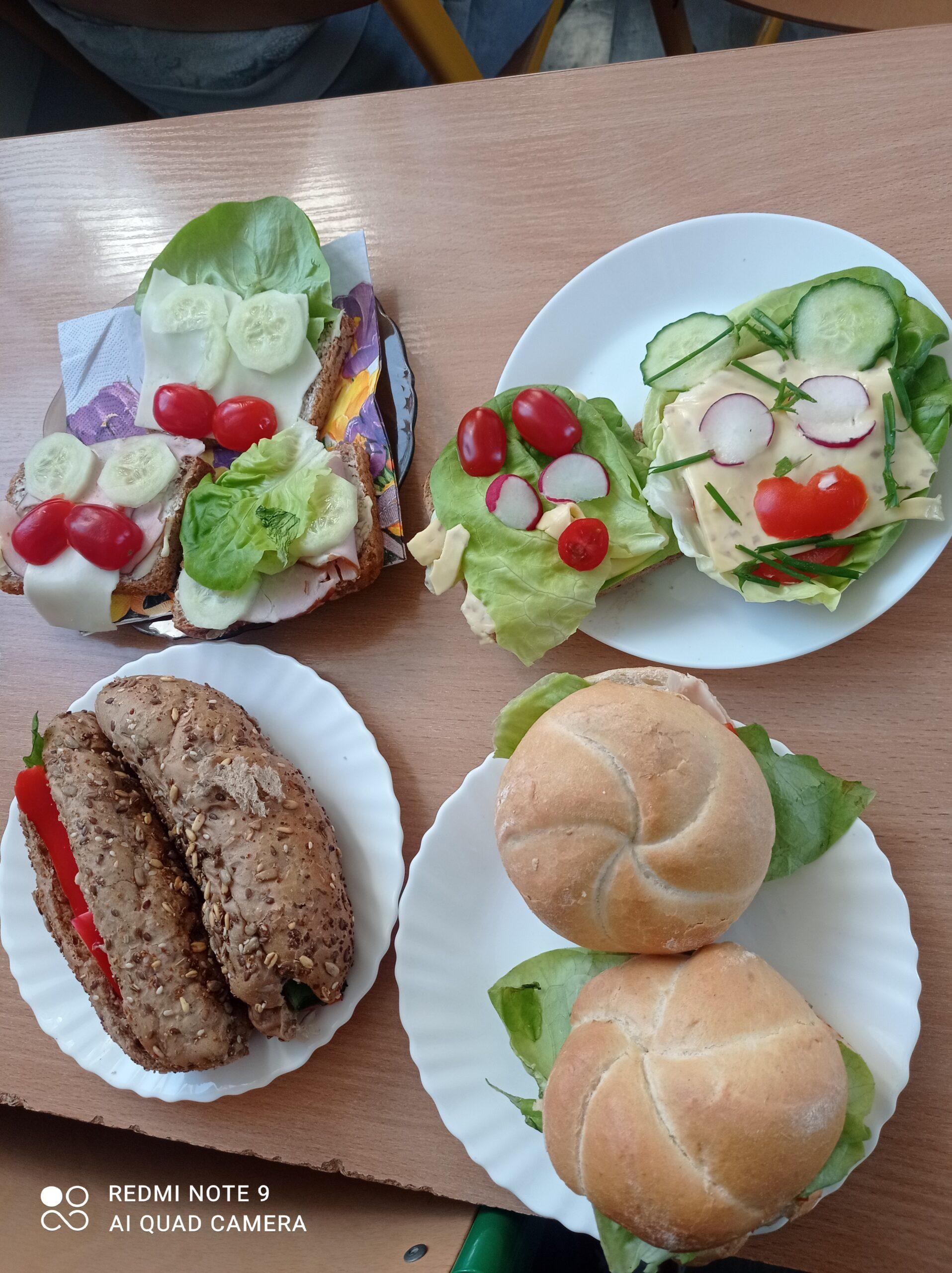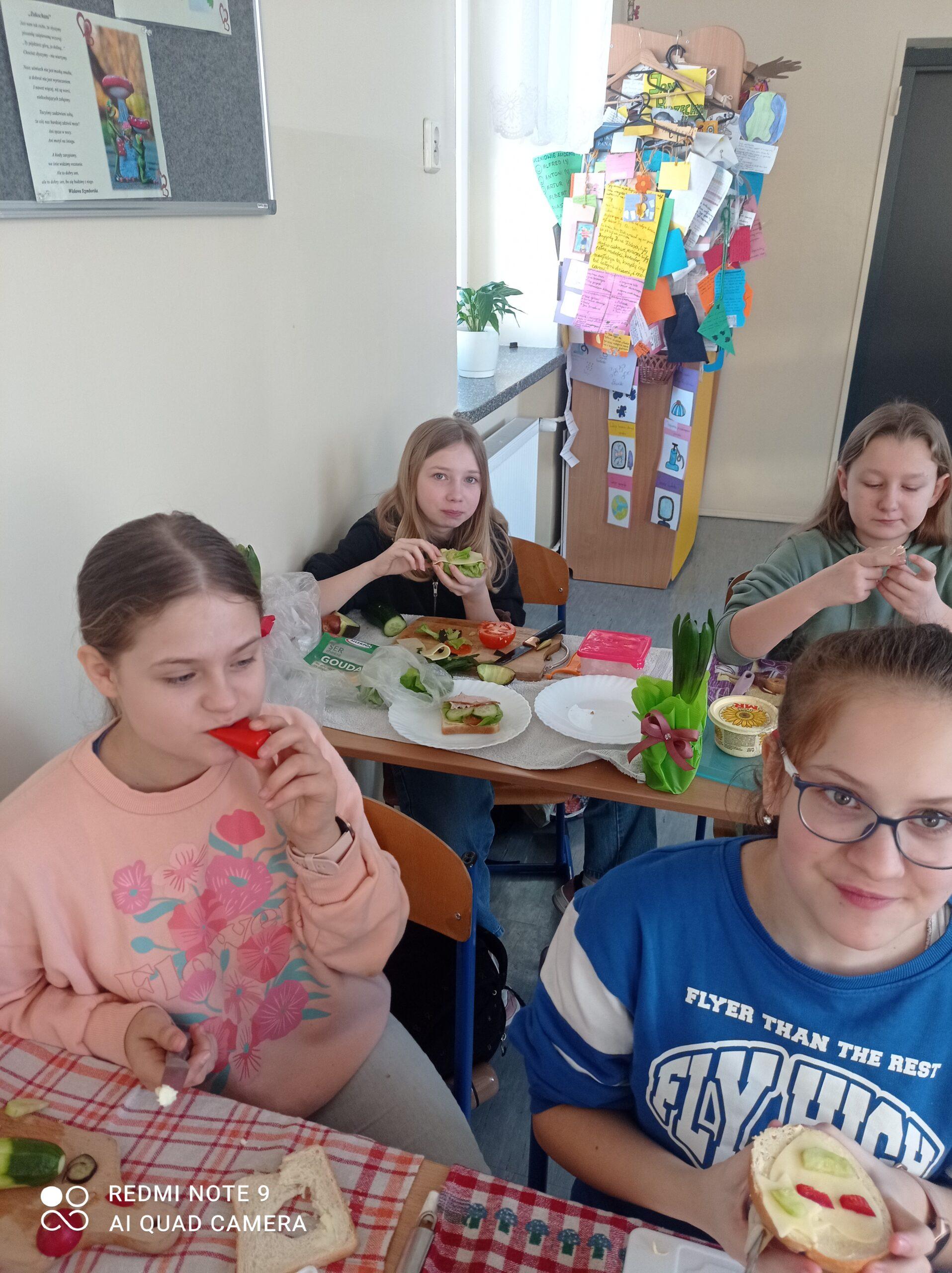 Wraz z nadejściem wiosny uczniowie klasy 4b postanowili wykonać zdrowe i kolorowe kanapki. Wszyscy profesjonalnie przygotowali się do tego zadania. Na początku lekcji wychowawczej obejrzeli prezentację multimedialną, w której poruszone zostały tematy bezpieczeństwa podczas pracy, higieny oraz wartości, jakie płyną ze zdrowego odżywania się. Następnie, po umyciu rąk, z dużym zaangażowaniem zabrali się do pracy. Możliwości i kombinacji dodatków było mnóstwo. Na stolikach zagościły: pomidorki, sałata, rzodkiewka, szczypiorek, ogórek, kiełki, rzodkiewki, ser, wędlina. Czwartoklasiści smarowali, kroili i układali produkty, tworząc na kanapkach wiosenne kolorowe wzory i nie tylko… Powstały pyszne kanapki, które z ochotą i smakiem zjedli na drugie śniadanie. Zadowolone miny potwierdziły, że najlepiej smakuje jedzenie zrobione własnoręcznie. Dzięki takim zajęciom dzieci kształtują w sobie odpowiednie nawyki żywieniowe, rozwijają kreatywność, wyobraźnię oraz dbałość o higienę podczas spożywania posiłków.                                                                                                                                                                 Opracowała: Marta Nogaj-Farbiś