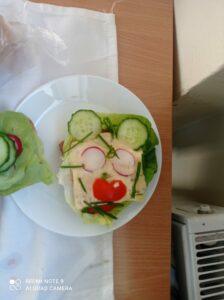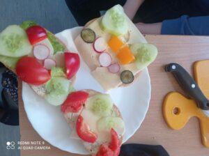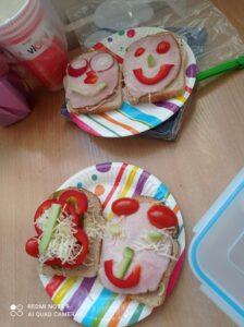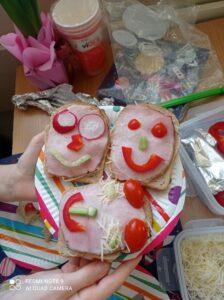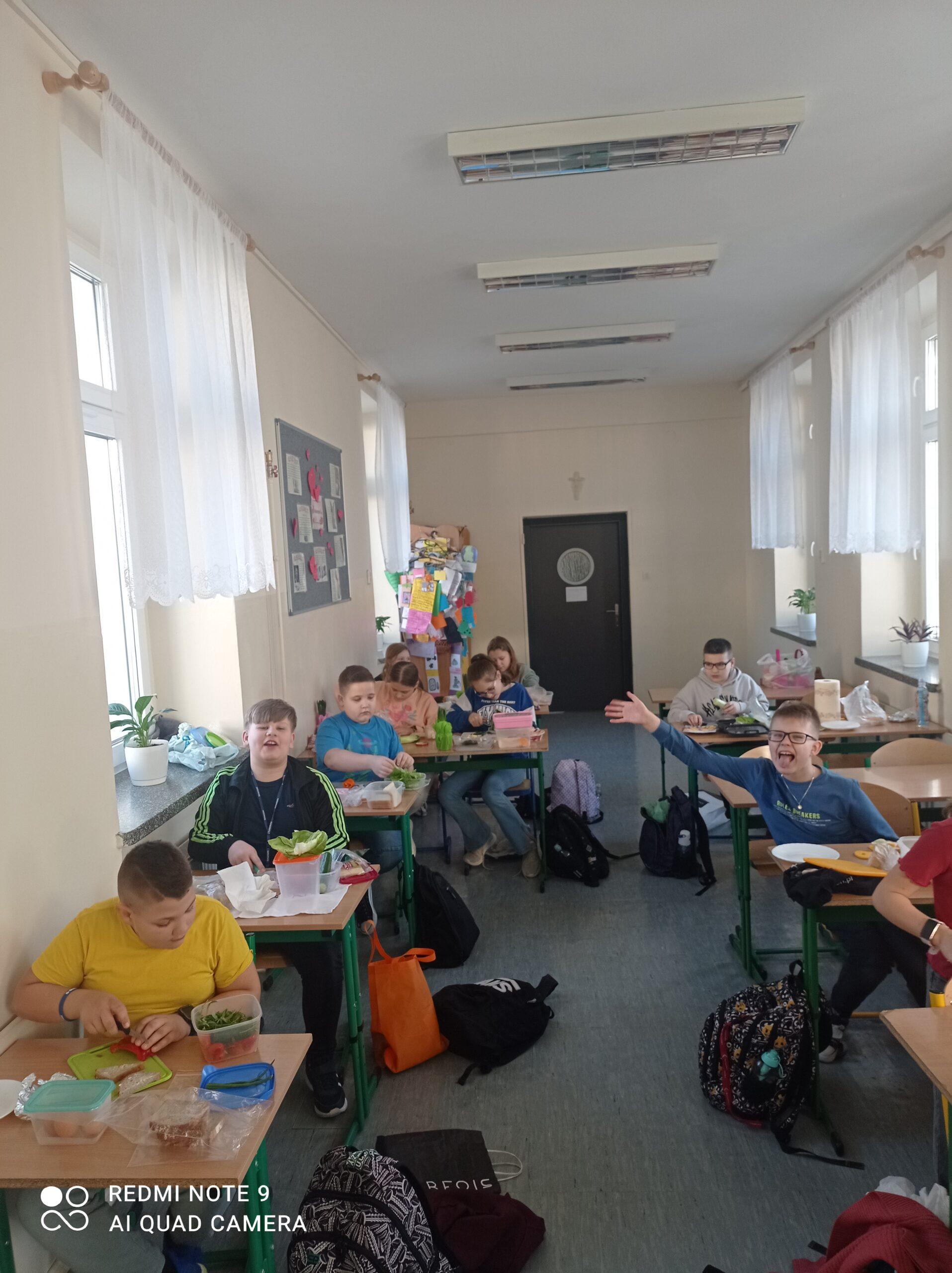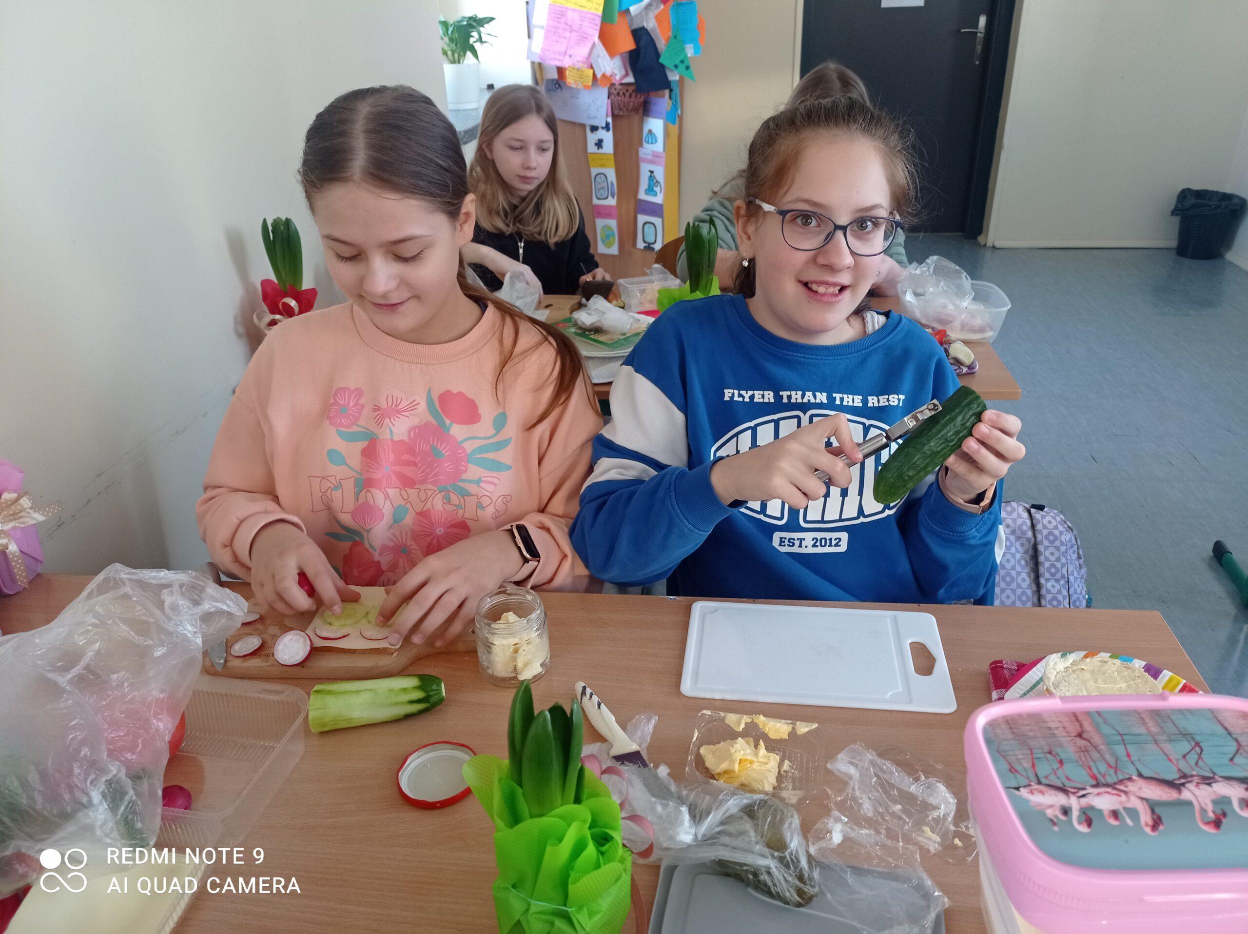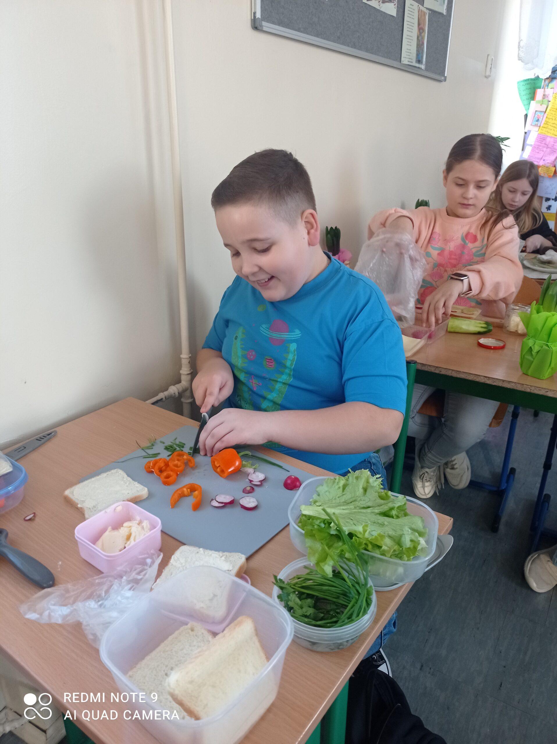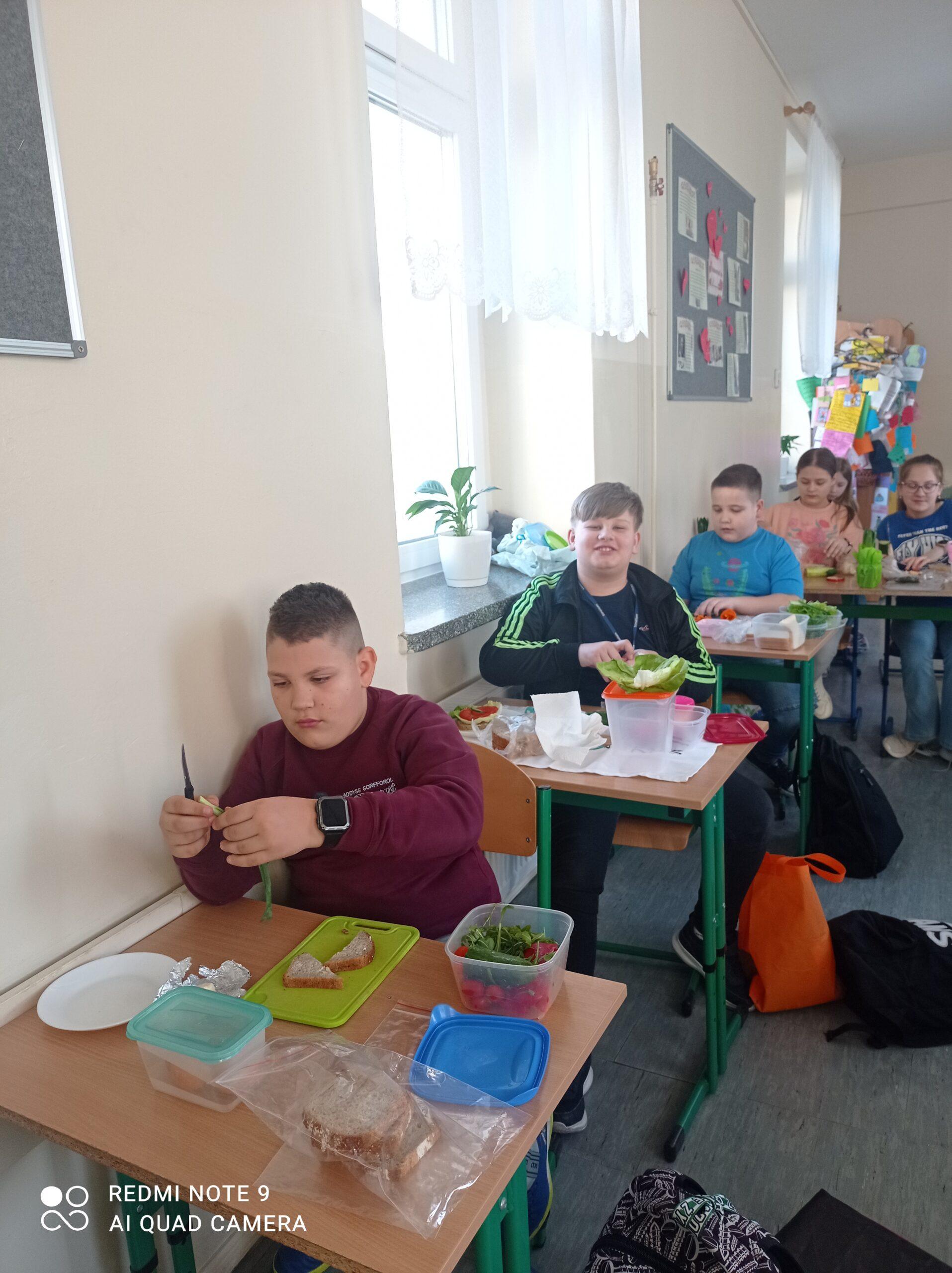 Wraz z nadejściem wiosny uczniowie klasy 4b postanowili wykonać zdrowe i kolorowe kanapki. Wszyscy profesjonalnie przygotowali się do tego zadania. Na początku lekcji wychowawczej obejrzeli prezentację multimedialną, w której poruszone zostały tematy bezpieczeństwa podczas pracy, higieny oraz wartości, jakie płyną ze zdrowego odżywania się. Następnie, po umyciu rąk, z dużym zaangażowaniem zabrali się do pracy. Możliwości i kombinacji dodatków było mnóstwo. Na stolikach zagościły: pomidorki, sałata, rzodkiewka, szczypiorek, ogórek, kiełki, rzodkiewki, ser, wędlina. Czwartoklasiści smarowali, kroili i układali produkty, tworząc na kanapkach wiosenne kolorowe wzory i nie tylko… Powstały pyszne kanapki, które z ochotą i smakiem zjedli na drugie śniadanie. Zadowolone miny potwierdziły, że najlepiej smakuje jedzenie zrobione własnoręcznie. Dzięki takim zajęciom dzieci kształtują w sobie odpowiednie nawyki żywieniowe, rozwijają kreatywność, wyobraźnię oraz dbałość o higienę podczas spożywania posiłków.                                                                                                                                                                 Opracowała: Marta Nogaj-Farbiś