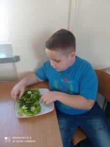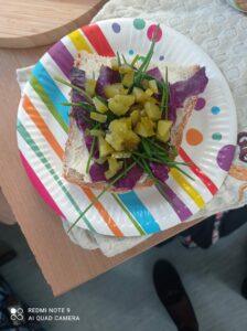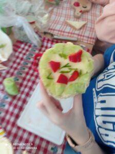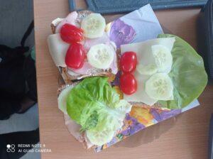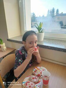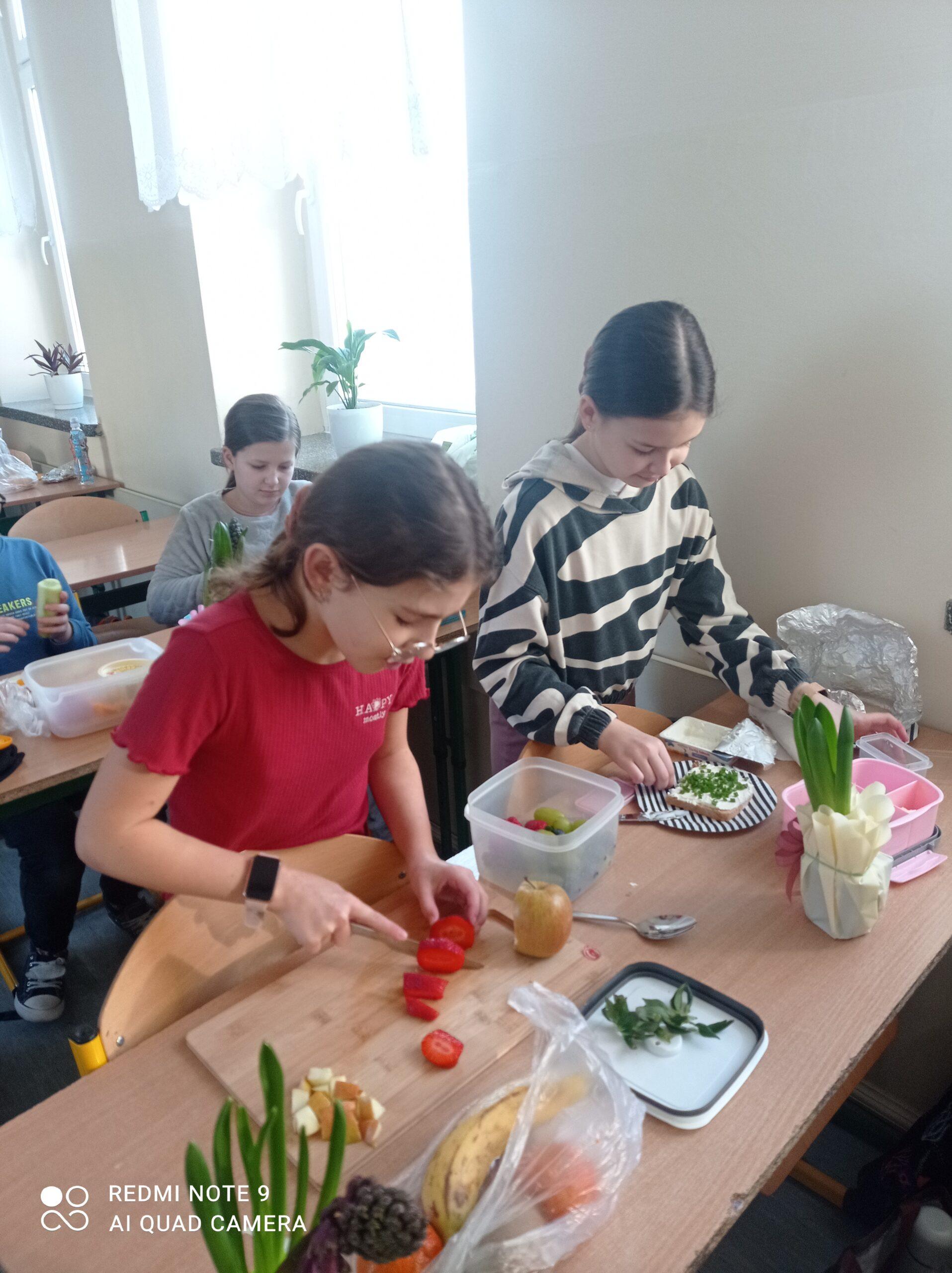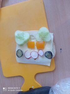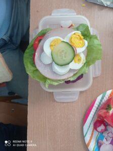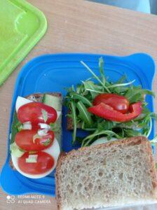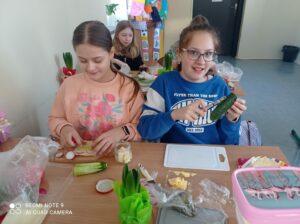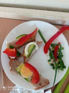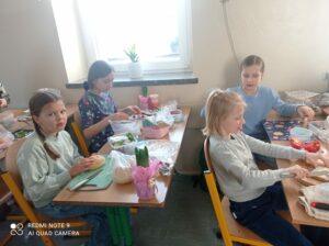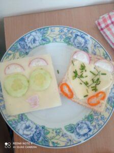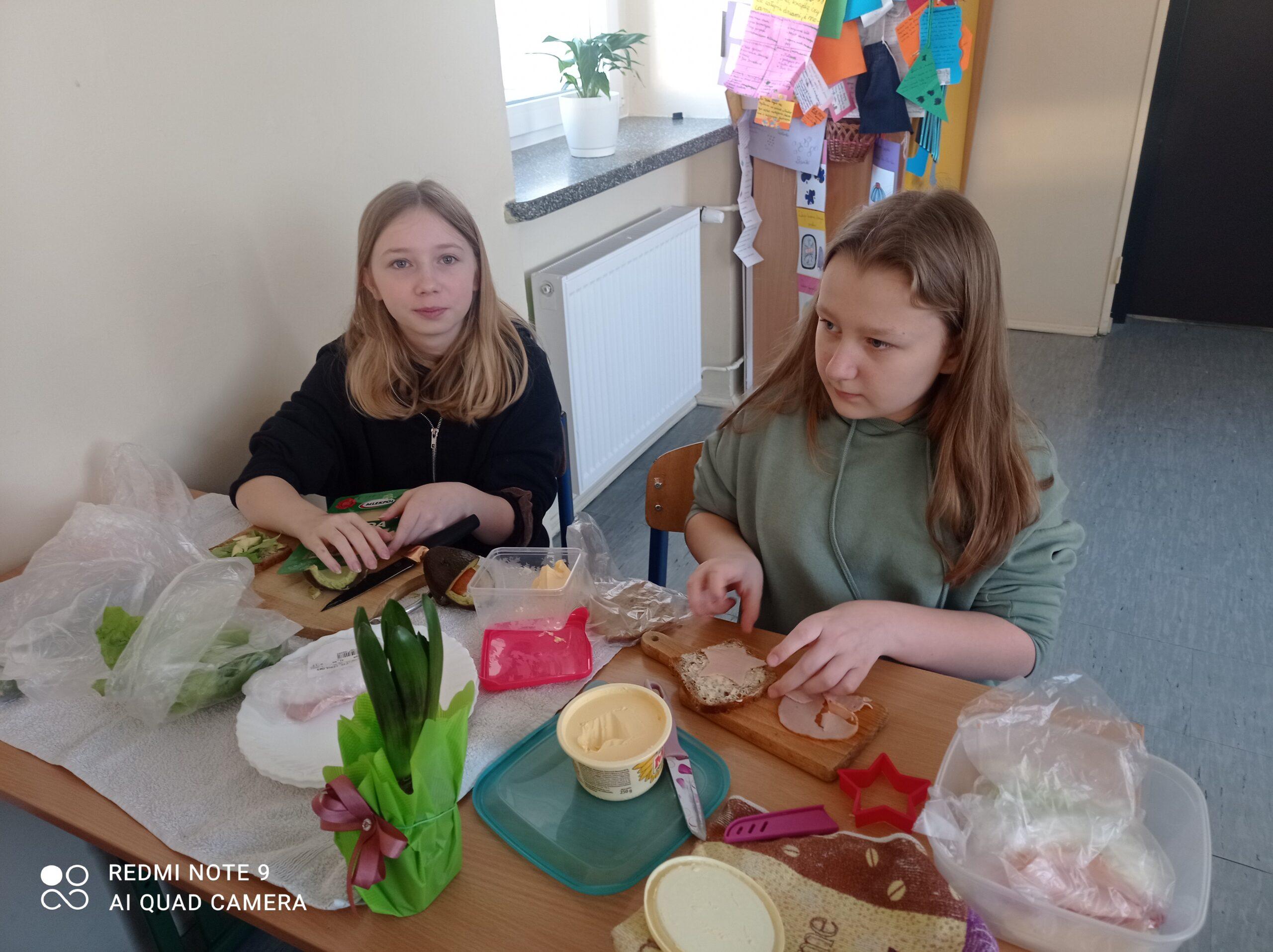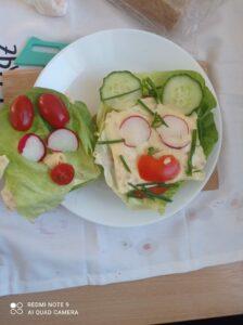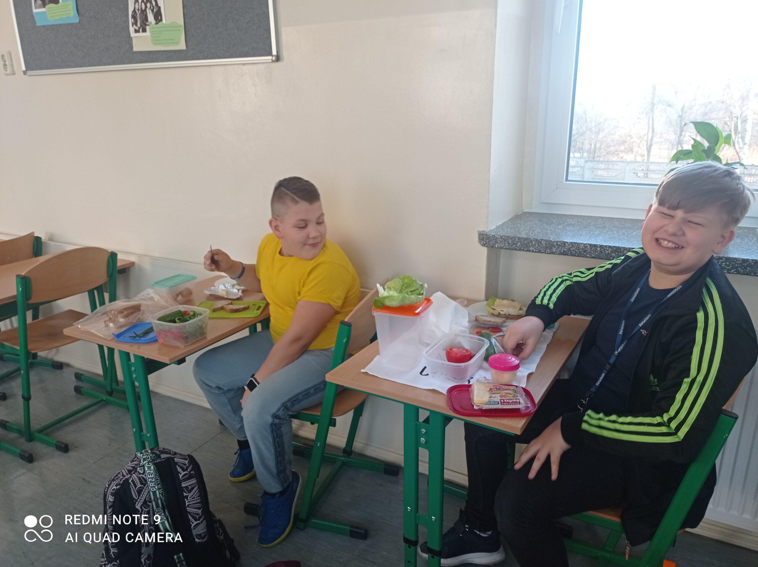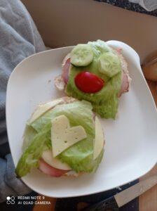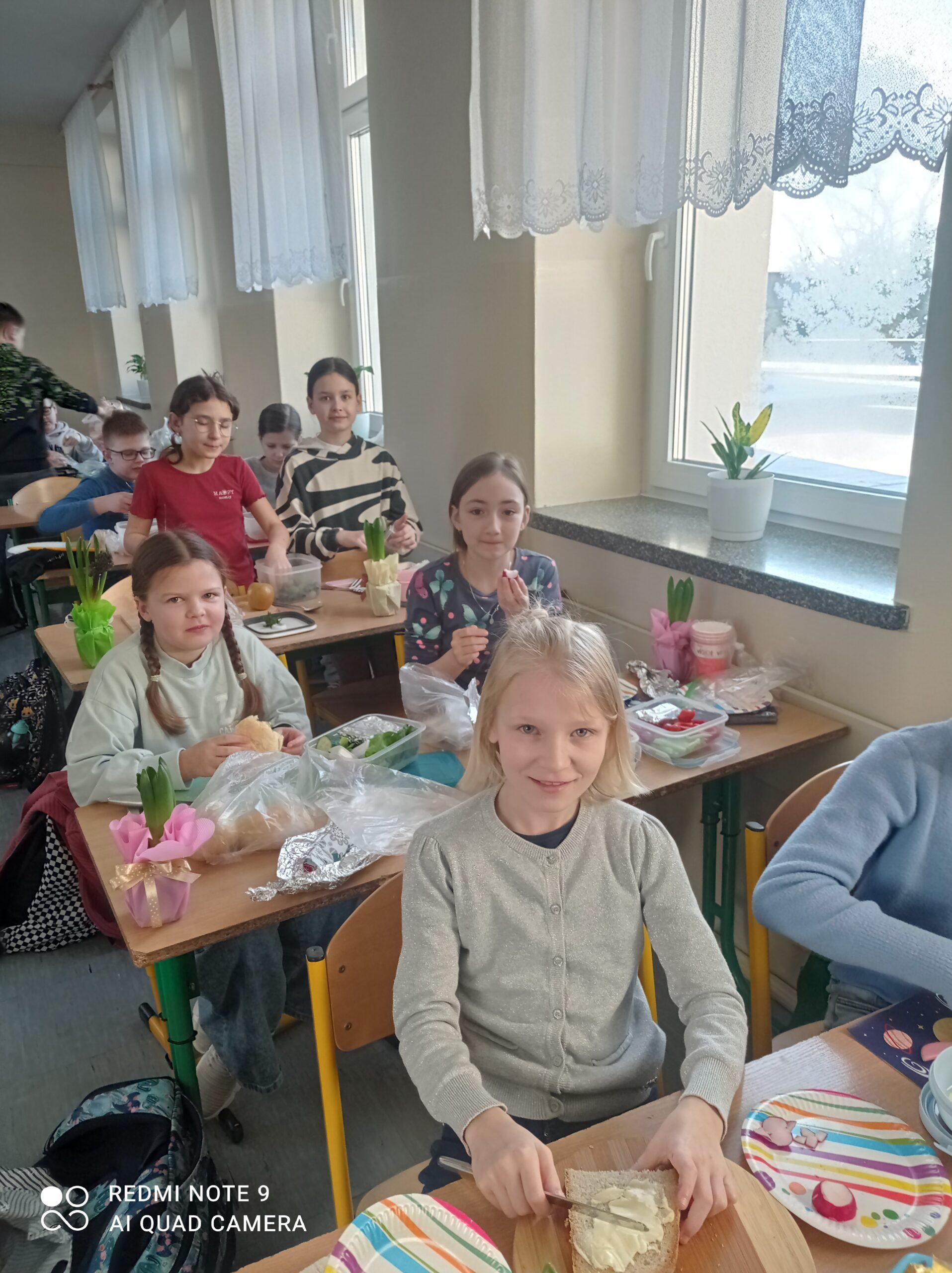 Wraz z nadejściem wiosny uczniowie klasy 4b postanowili wykonać zdrowe i kolorowe kanapki. Wszyscy profesjonalnie przygotowali się do tego zadania. Na początku lekcji wychowawczej obejrzeli prezentację multimedialną, w której poruszone zostały tematy bezpieczeństwa podczas pracy, higieny oraz wartości, jakie płyną ze zdrowego odżywania się. Następnie, po umyciu rąk, z dużym zaangażowaniem zabrali się do pracy. Możliwości i kombinacji dodatków było mnóstwo. Na stolikach zagościły: pomidorki, sałata, rzodkiewka, szczypiorek, ogórek, kiełki, rzodkiewki, ser, wędlina. Czwartoklasiści smarowali, kroili i układali produkty, tworząc na kanapkach wiosenne kolorowe wzory i nie tylko… Powstały pyszne kanapki, które z ochotą i smakiem zjedli na drugie śniadanie. Zadowolone miny potwierdziły, że najlepiej smakuje jedzenie zrobione własnoręcznie. Dzięki takim zajęciom dzieci kształtują w sobie odpowiednie nawyki żywieniowe, rozwijają kreatywność, wyobraźnię oraz dbałość o higienę podczas spożywania posiłków.                                                                                                                                                                 Opracowała: Marta Nogaj-Farbiś