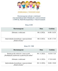 Harmonogram zebrań z rodzicami oraz konsultacji indywidualnych z nauczycielami w PSP im. Marii Konopnickiej w Mazowszanach